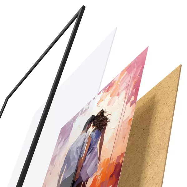 De poster bestaat uit een frame, plexiglas, geprinte afbeelding en spaanplaat achterkant. De poster kan meteen aan de muur worden gehangen dankzij de bevestigingen op de achterkant.