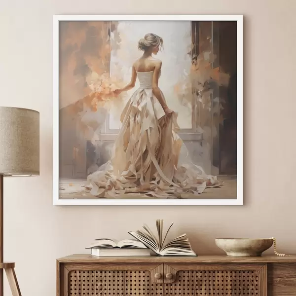 Poster Een meisje in een witte trouwjurk staat bij het raam tussen het vuur en schildert met de hand Nr f39125