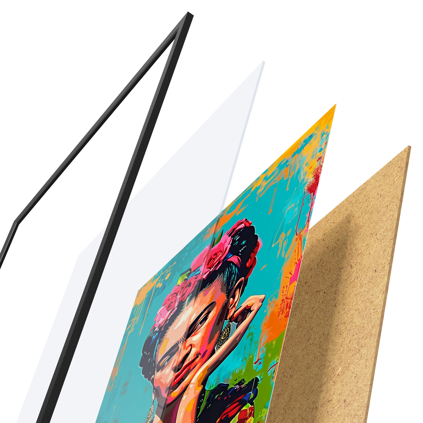 De poster bestaat uit een frame, plexiglas, geprinte afbeelding en spaanplaat achterkant. De poster kan meteen aan de muur worden gehangen dankzij de bevestigingen op de achterkant.