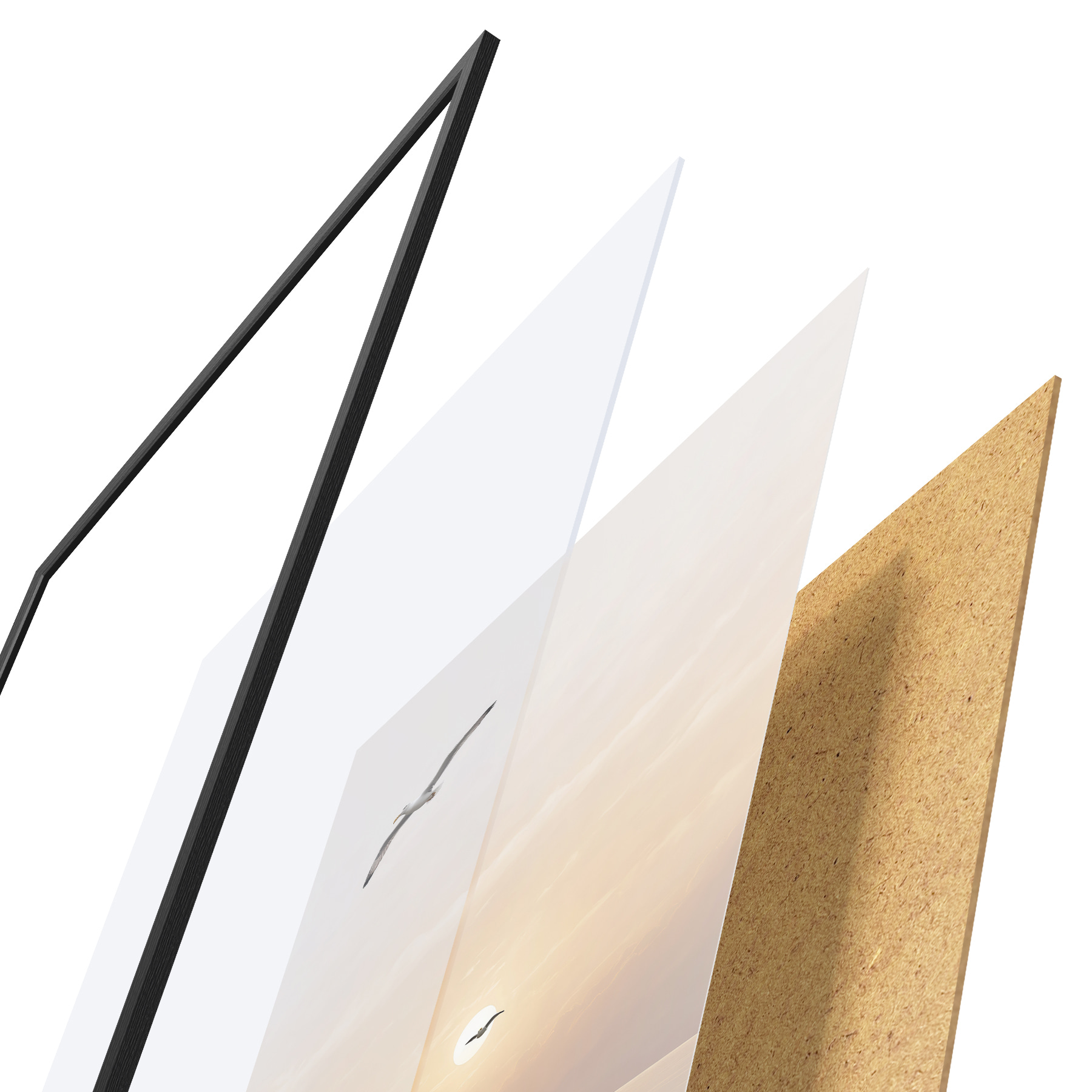 De poster bestaat uit een frame, plexiglas, geprinte afbeelding en spaanplaat achterkant. De poster kan meteen aan de muur worden gehangen dankzij de bevestigingen op de achterkant.
