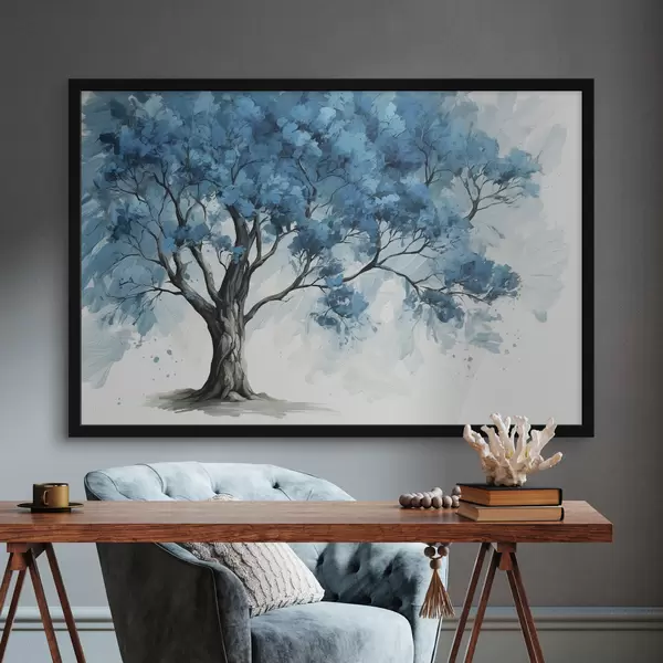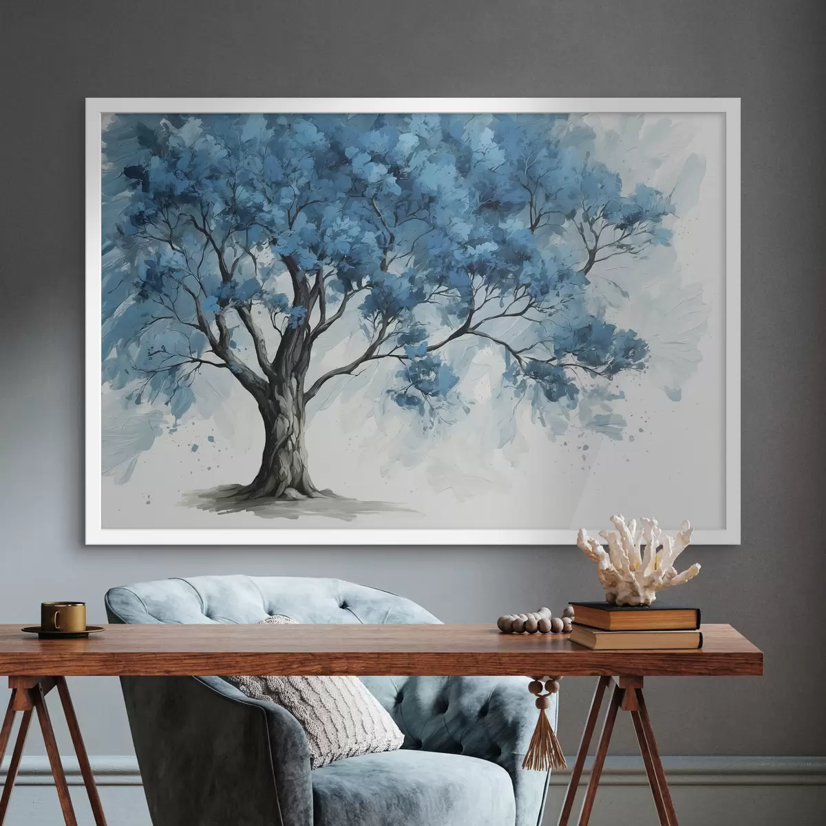 Poster Boom met blauwe bladeren op witte achtergrond Nr f39153