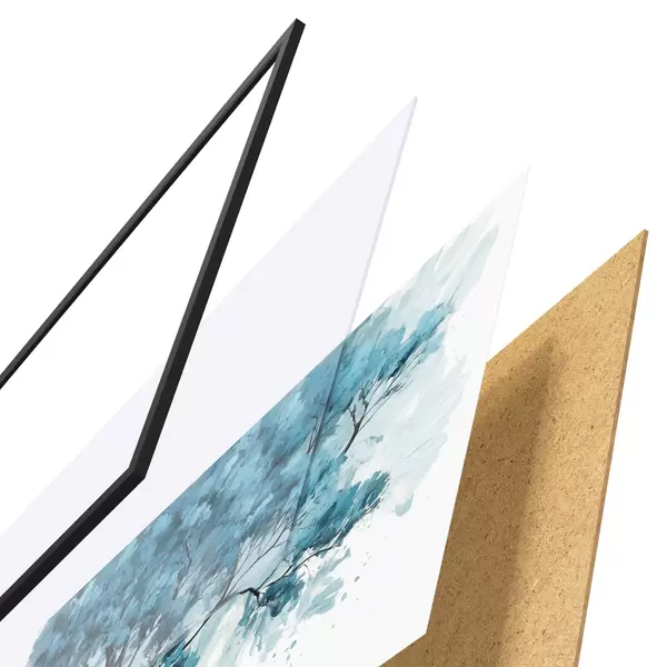 De poster bestaat uit een frame, plexiglas, geprinte afbeelding en spaanplaat achterkant. De poster kan meteen aan de muur worden gehangen dankzij de bevestigingen op de achterkant.