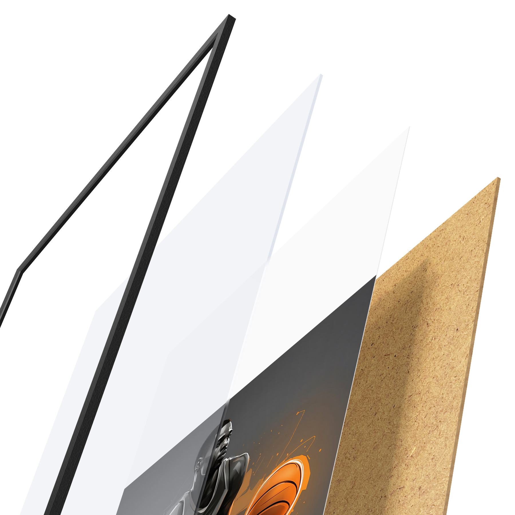 De poster bestaat uit een frame, plexiglas, geprinte afbeelding en spaanplaat achterkant. De poster kan meteen aan de muur worden gehangen dankzij de bevestigingen op de achterkant.
