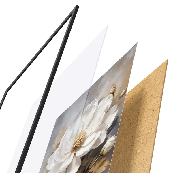 De poster bestaat uit een frame, plexiglas, geprinte afbeelding en spaanplaat achterkant. De poster kan meteen aan de muur worden gehangen dankzij de bevestigingen op de achterkant.