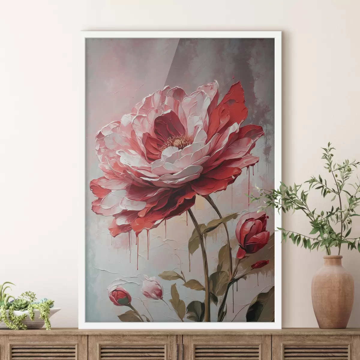 Poster Rode bloem op wit-grijze achtergrond f39173