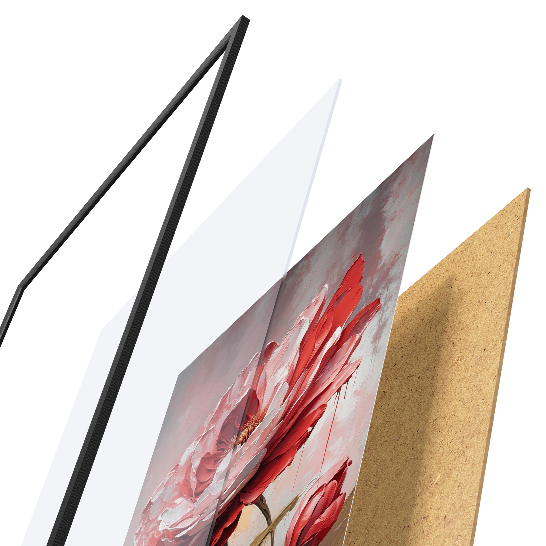 De poster bestaat uit een frame, plexiglas, geprinte afbeelding en spaanplaat achterkant. De poster kan meteen aan de muur worden gehangen dankzij de bevestigingen op de achterkant.