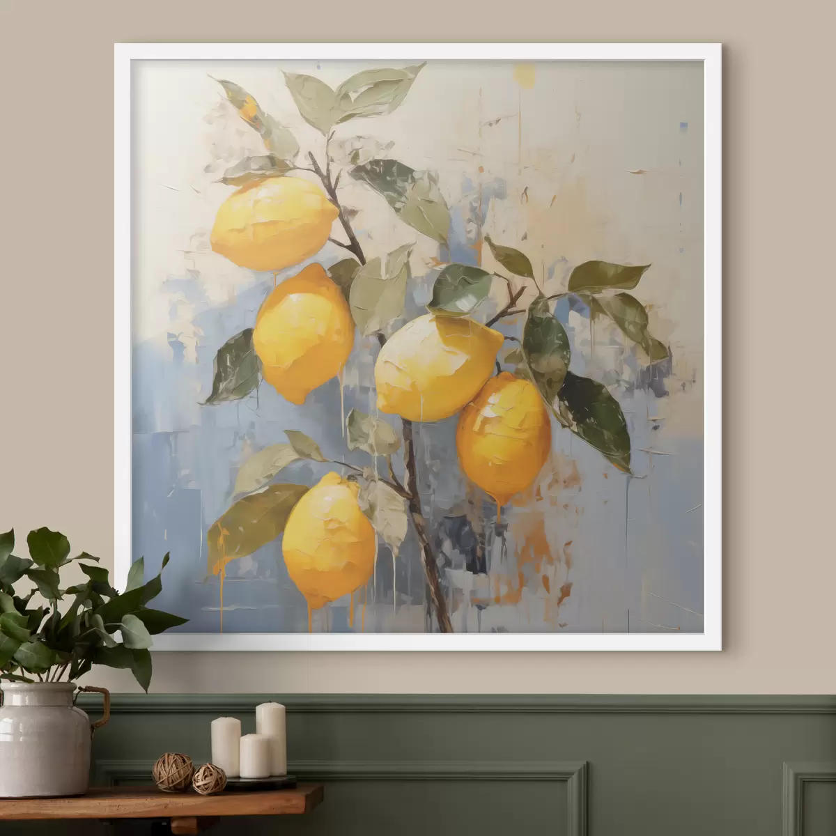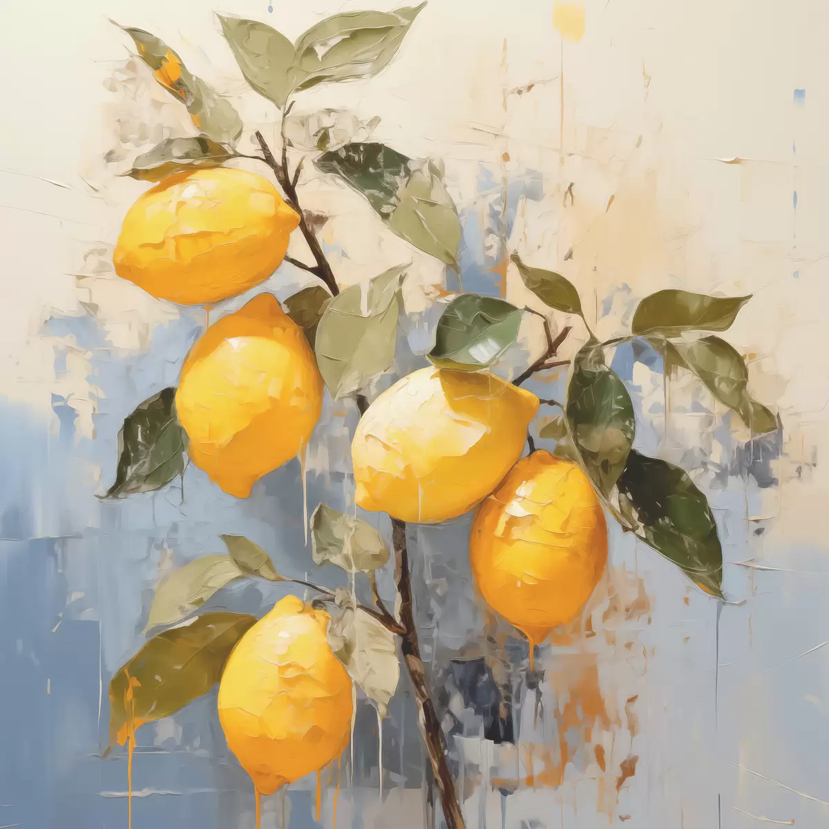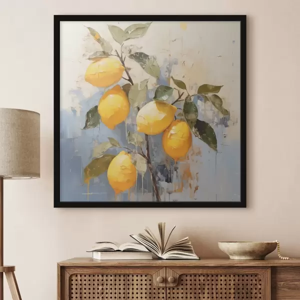 Poster Tak met rijpe citroenen, olieverfschilderij, abstracte kunst, gele, blauwe en groene kleuren Nr f39186