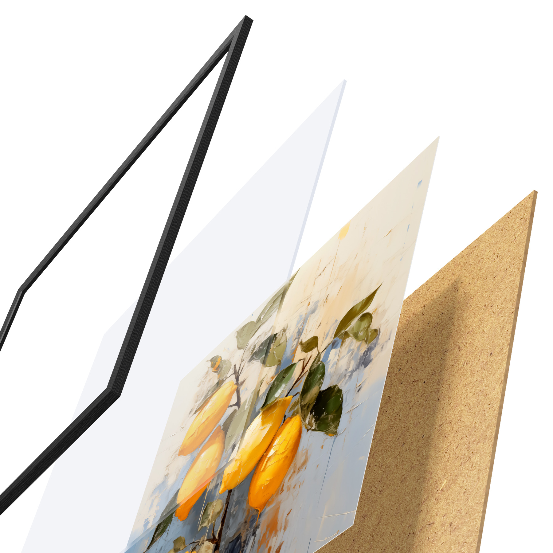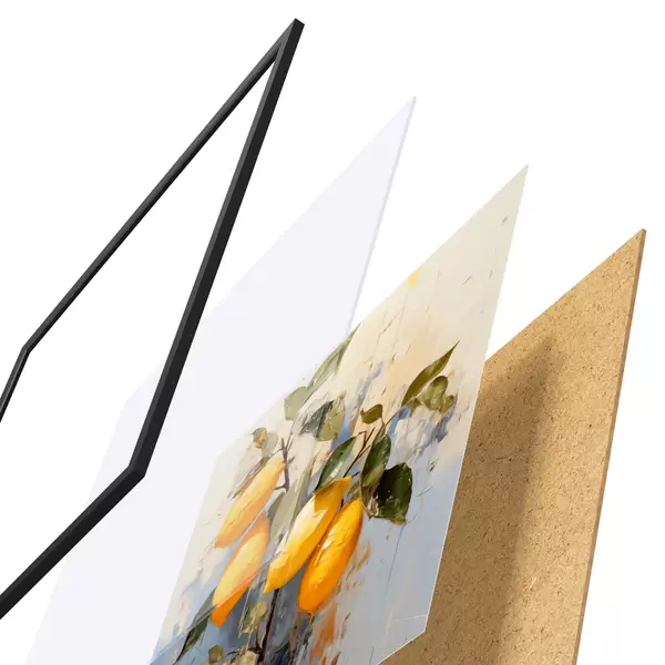 De poster bestaat uit een frame, plexiglas, geprinte afbeelding en spaanplaat achterkant. De poster kan meteen aan de muur worden gehangen dankzij de bevestigingen op de achterkant.