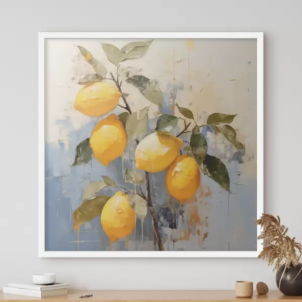 Poster Tak met rijpe citroenen, olieverfschilderij, abstracte kunst, gele, blauwe en groene kleuren Nr f39186