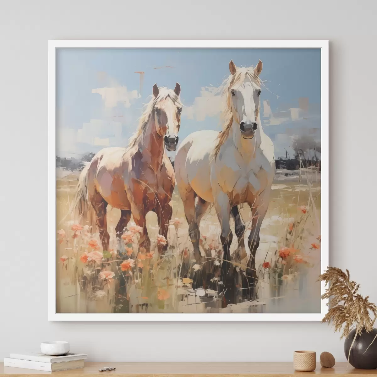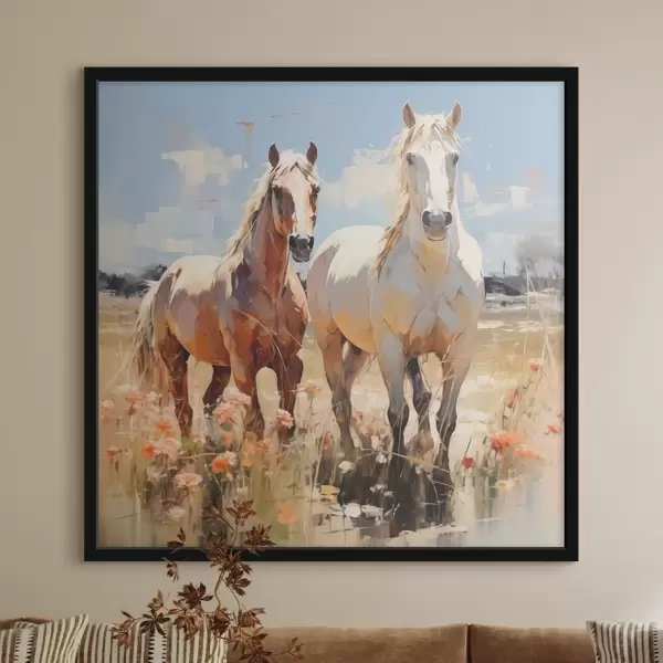 Poster Witte en bruine paarden grazen in een weide tussen wilde bloemen, olieverfschilderij, abstracte kunst Nr f39187