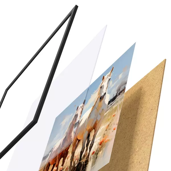 De poster bestaat uit een frame, plexiglas, geprinte afbeelding en spaanplaat achterkant. De poster kan meteen aan de muur worden gehangen dankzij de bevestigingen op de achterkant.