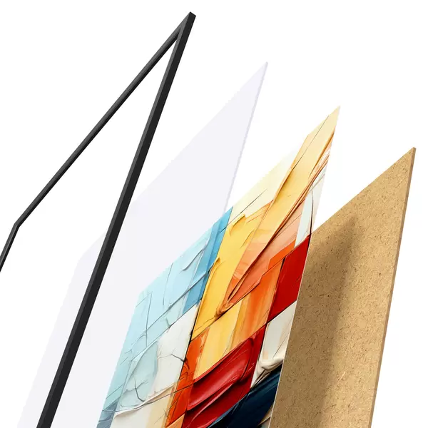 De poster bestaat uit een frame, plexiglas, geprinte afbeelding en spaanplaat achterkant. De poster kan meteen aan de muur worden gehangen dankzij de bevestigingen op de achterkant.