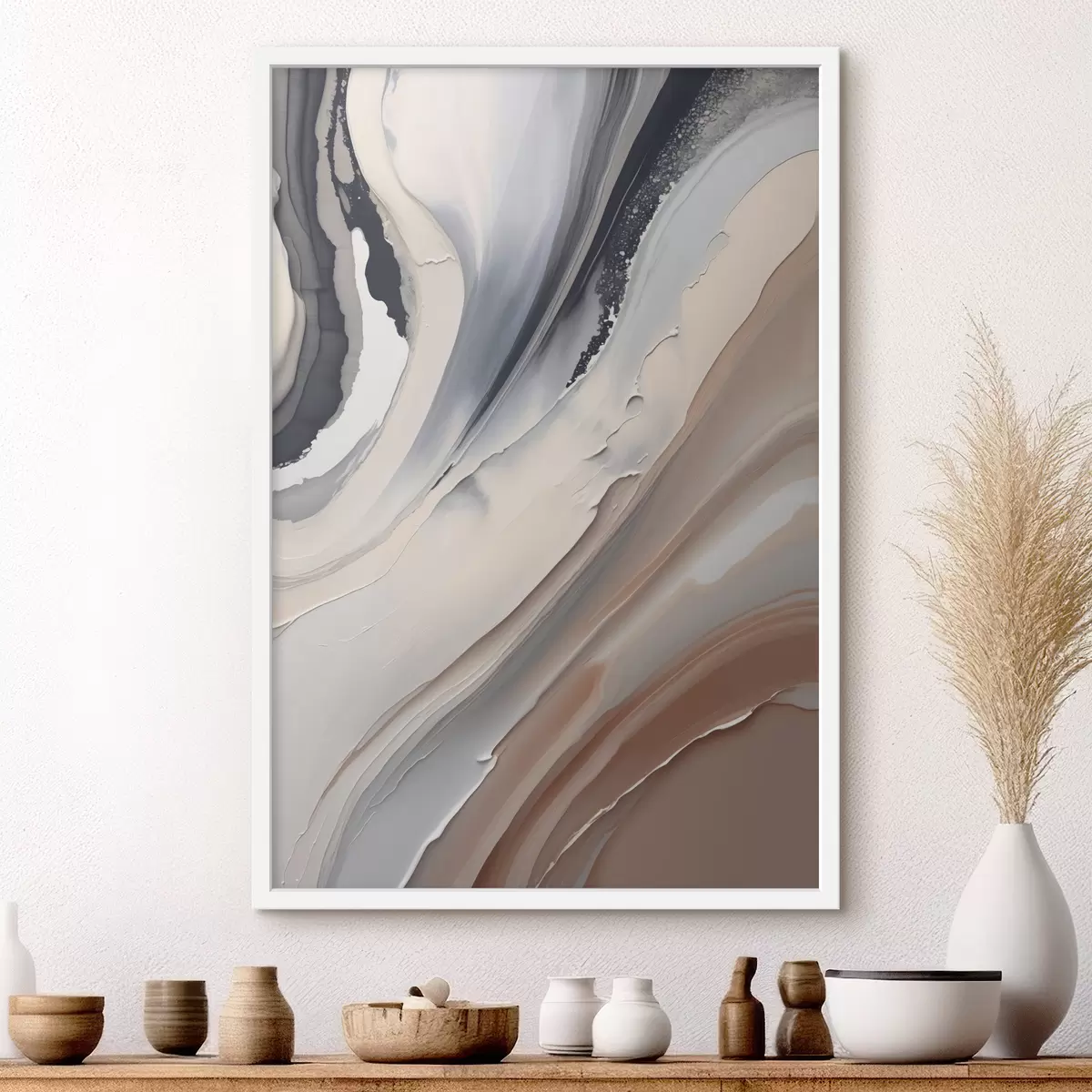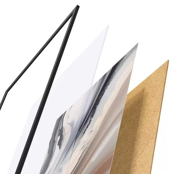 De poster bestaat uit een frame, plexiglas, geprinte afbeelding en spaanplaat achterkant. De poster kan meteen aan de muur worden gehangen dankzij de bevestigingen op de achterkant.