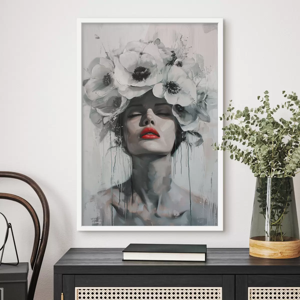Poster Portret van een vrouw met bloemen in haar haar en rode lippen Nr f39253