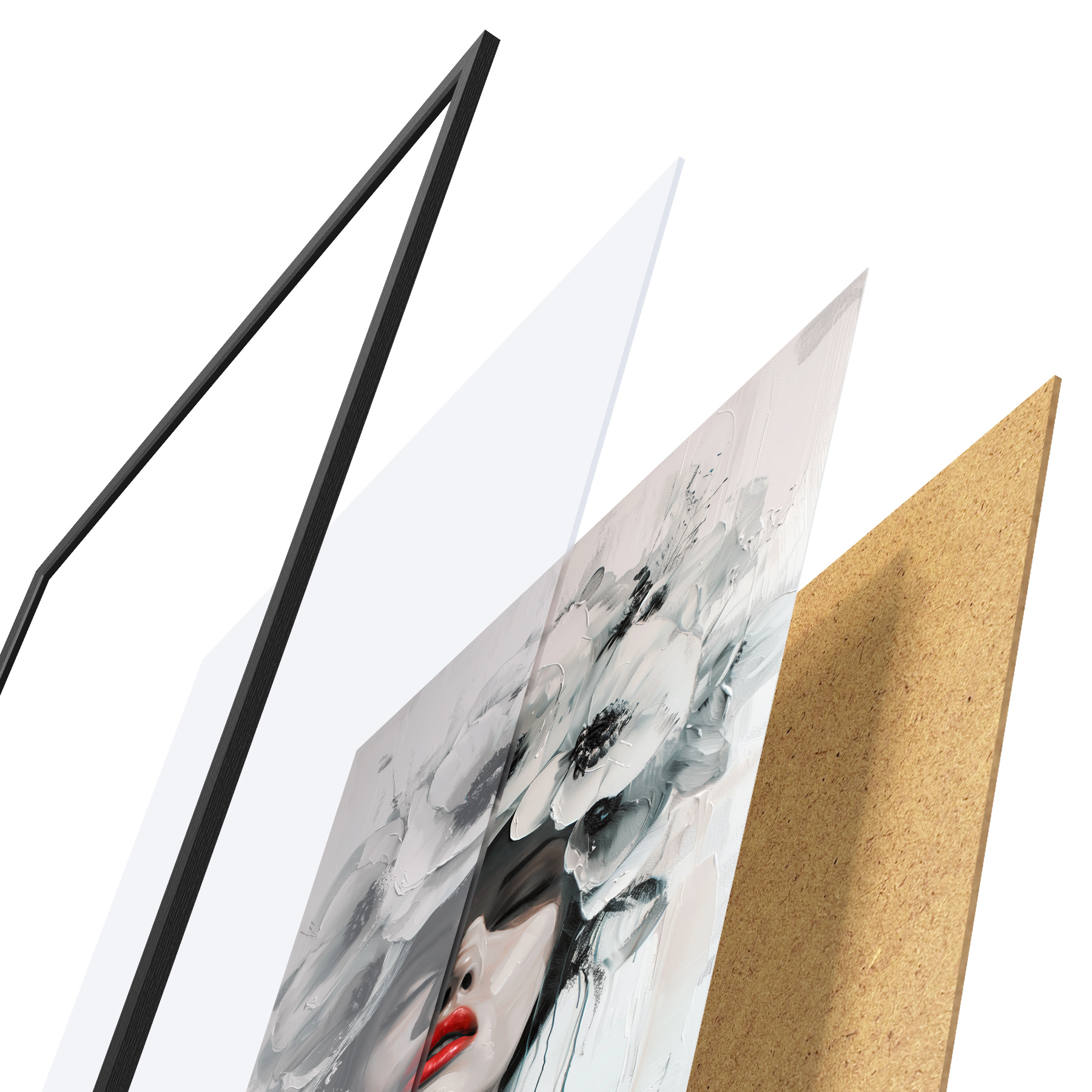 De poster bestaat uit een frame, plexiglas, geprinte afbeelding en spaanplaat achterkant. De poster kan meteen aan de muur worden gehangen dankzij de bevestigingen op de achterkant.