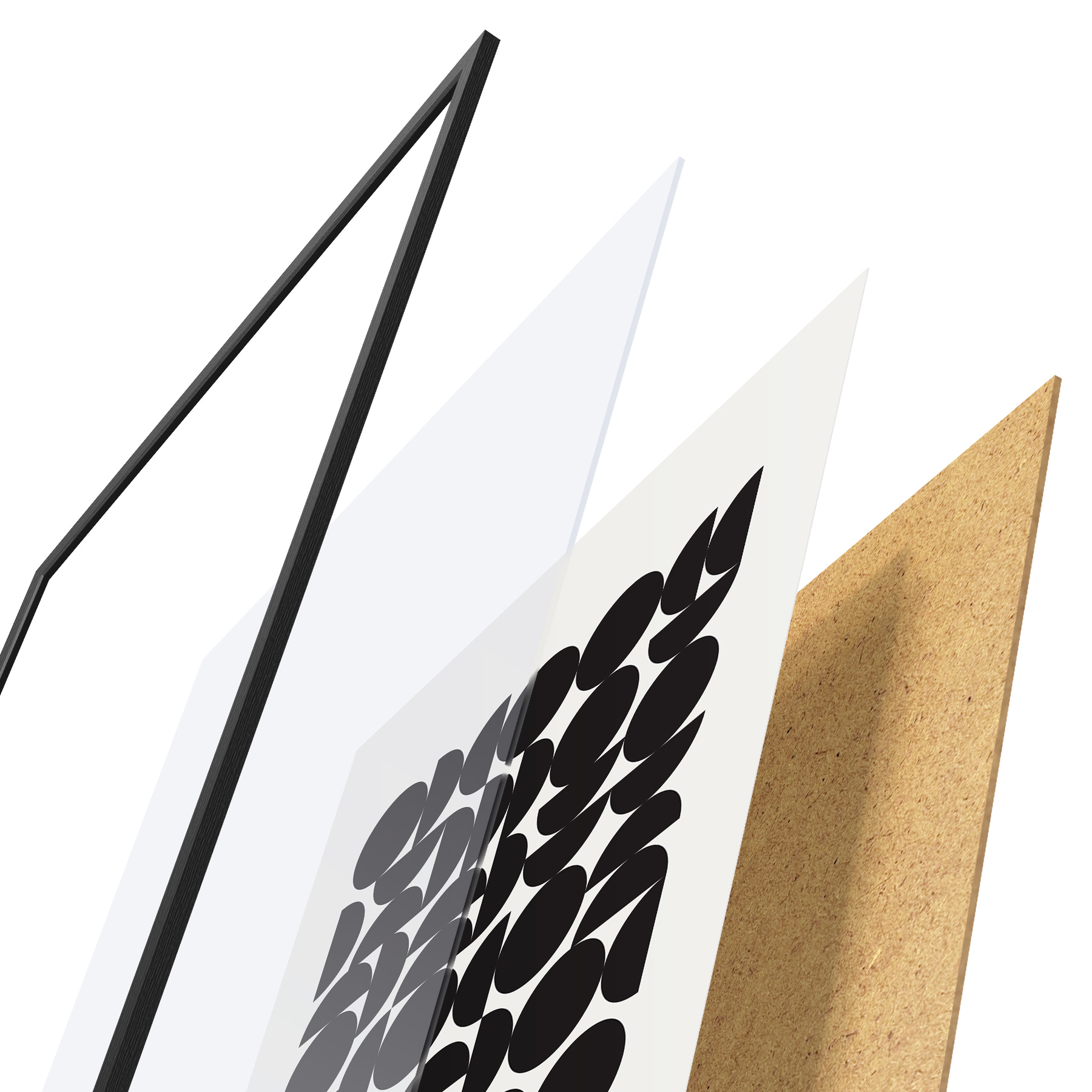 De poster bestaat uit een frame, plexiglas, geprinte afbeelding en spaanplaat achterkant. De poster kan meteen aan de muur worden gehangen dankzij de bevestigingen op de achterkant.