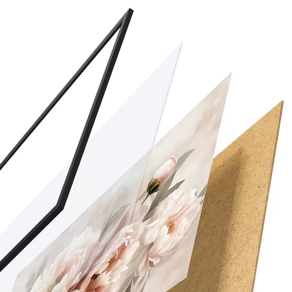 De poster bestaat uit een frame, plexiglas, geprinte afbeelding en spaanplaat achterkant. De poster kan meteen aan de muur worden gehangen dankzij de bevestigingen op de achterkant.