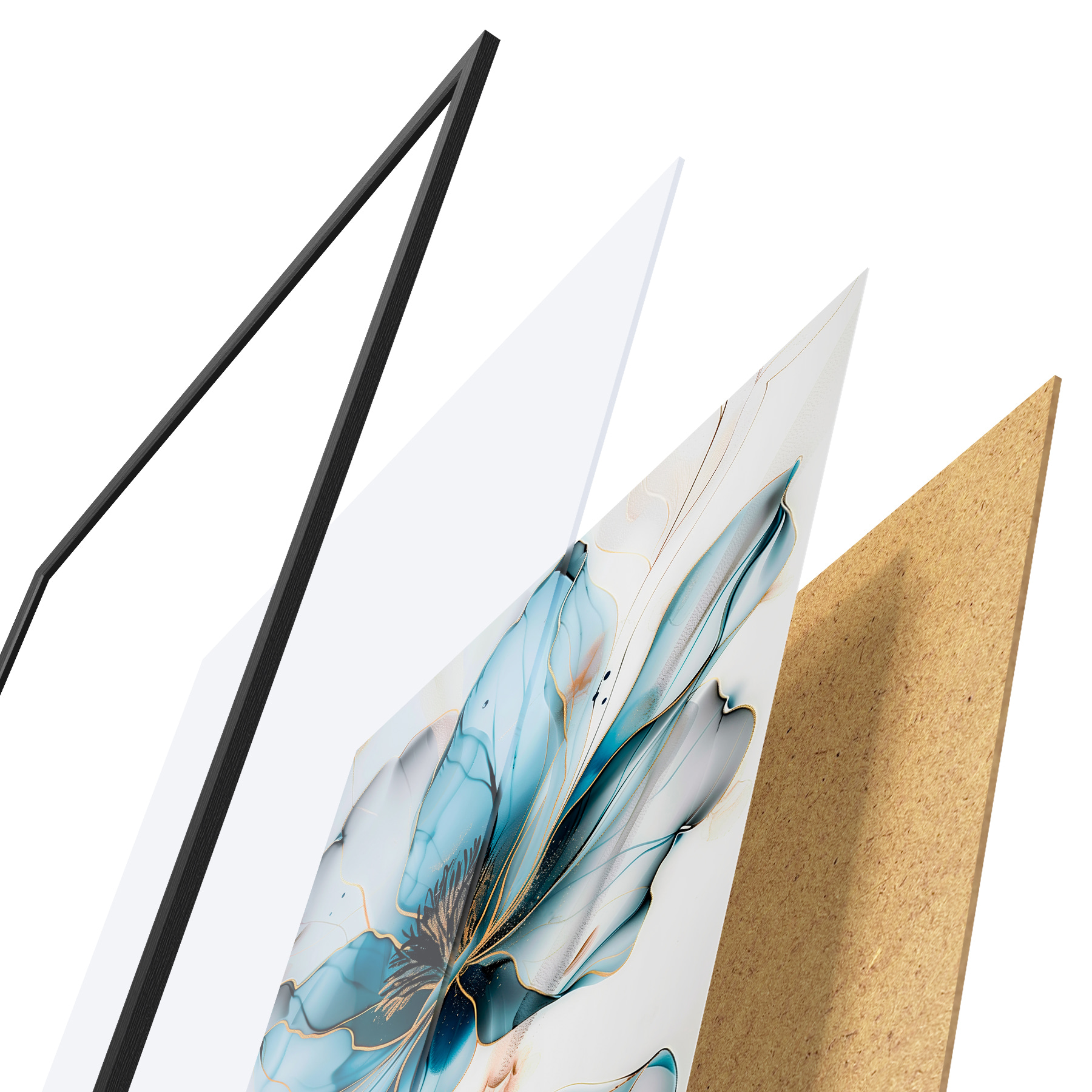 De poster bestaat uit een frame, plexiglas, geprinte afbeelding en spaanplaat achterkant. De poster kan meteen aan de muur worden gehangen dankzij de bevestigingen op de achterkant.