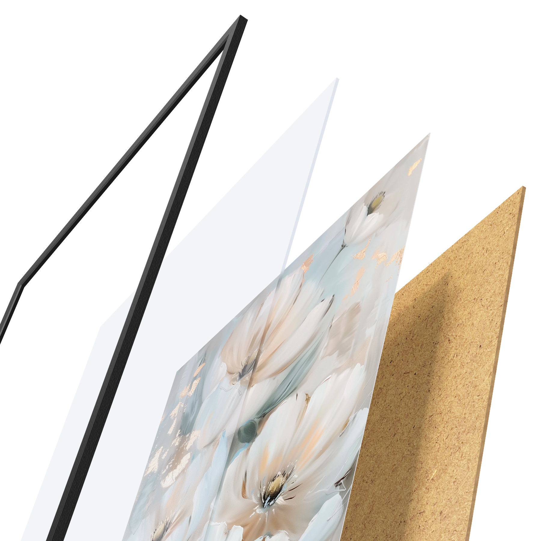 De poster bestaat uit een frame, plexiglas, geprinte afbeelding en spaanplaat achterkant. De poster kan meteen aan de muur worden gehangen dankzij de bevestigingen op de achterkant.