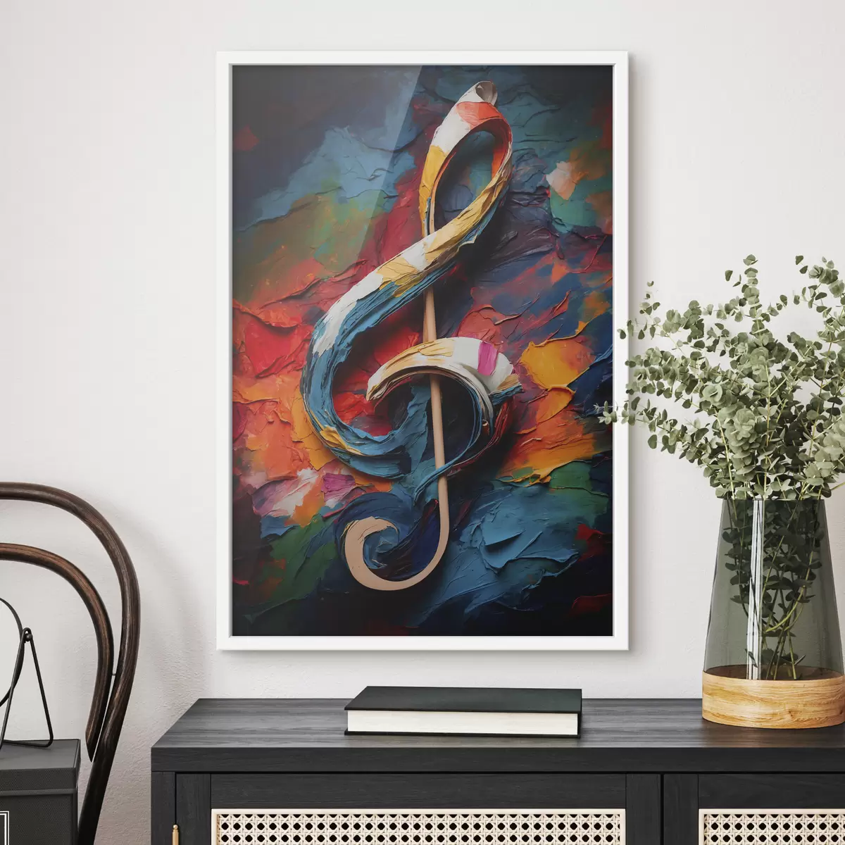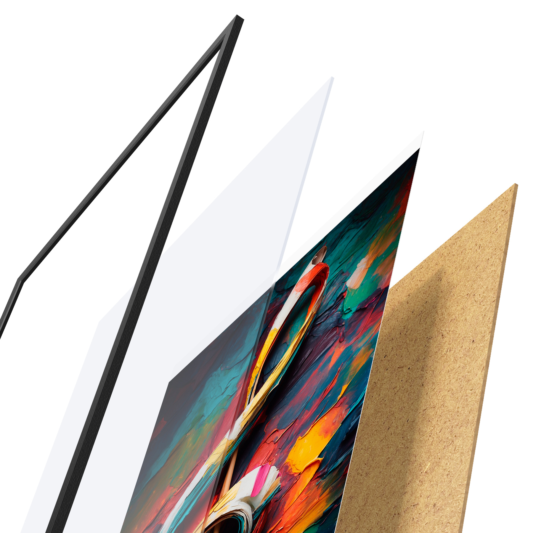 De poster bestaat uit een frame, plexiglas, geprinte afbeelding en spaanplaat achterkant. De poster kan meteen aan de muur worden gehangen dankzij de bevestigingen op de achterkant.