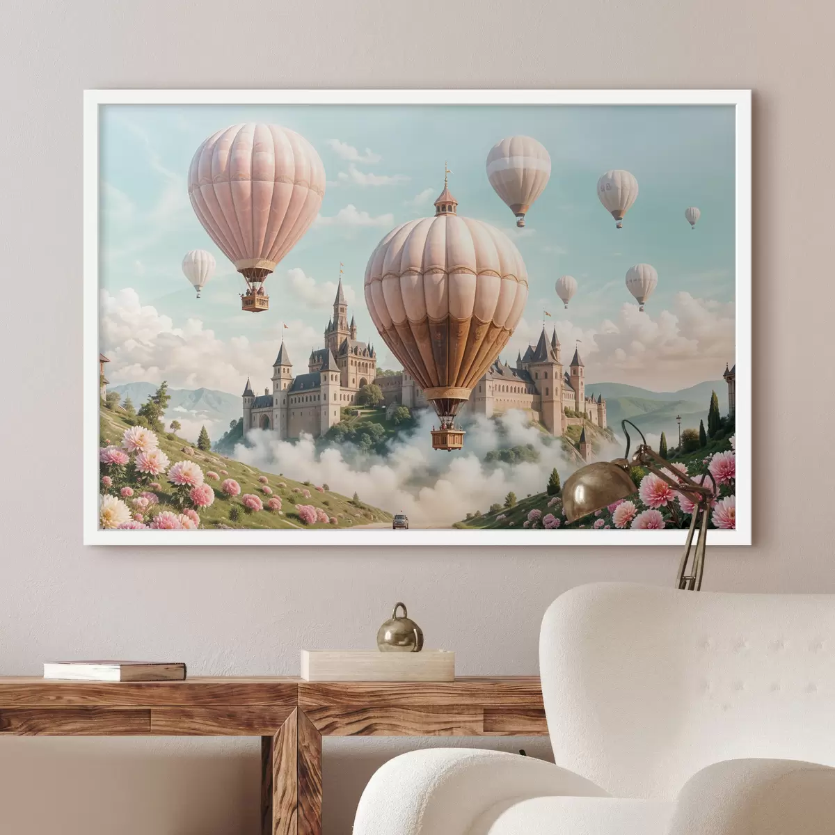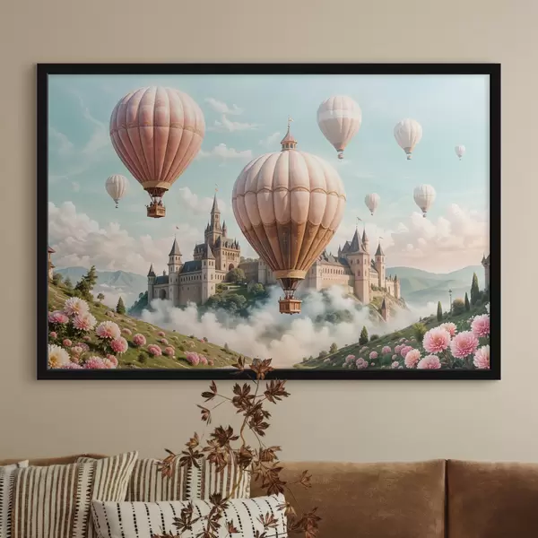 Poster Een fantasiekasteel omringd door roze heteluchtballonnen die in een bewolkte hemel boven een weelderig, groen landschap zweven Nr f39387