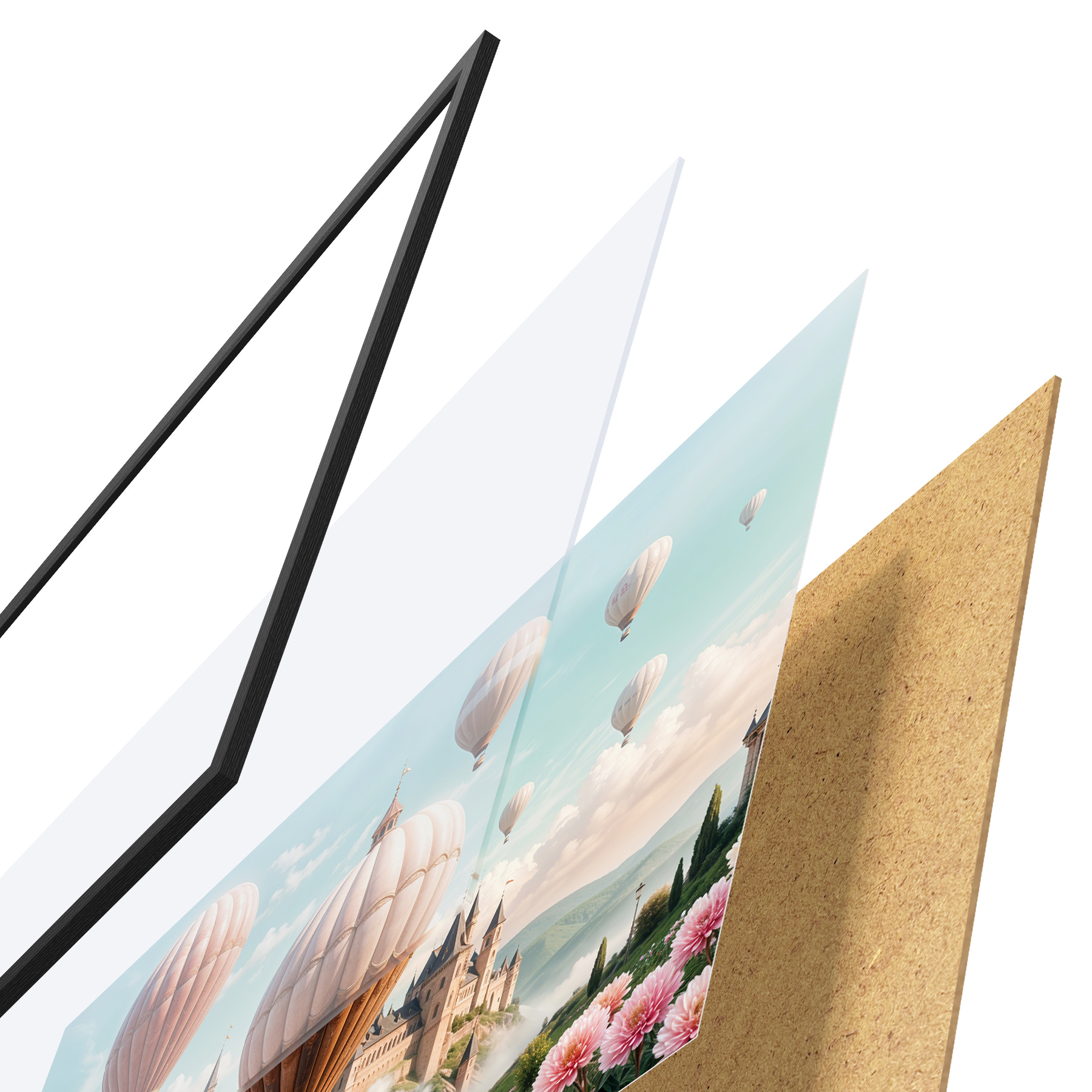 De poster bestaat uit een frame, plexiglas, geprinte afbeelding en spaanplaat achterkant. De poster kan meteen aan de muur worden gehangen dankzij de bevestigingen op de achterkant.