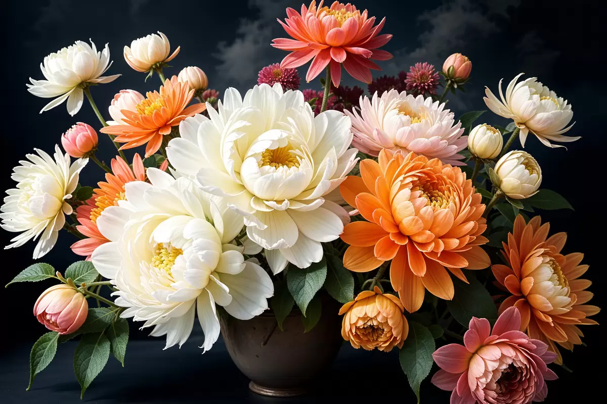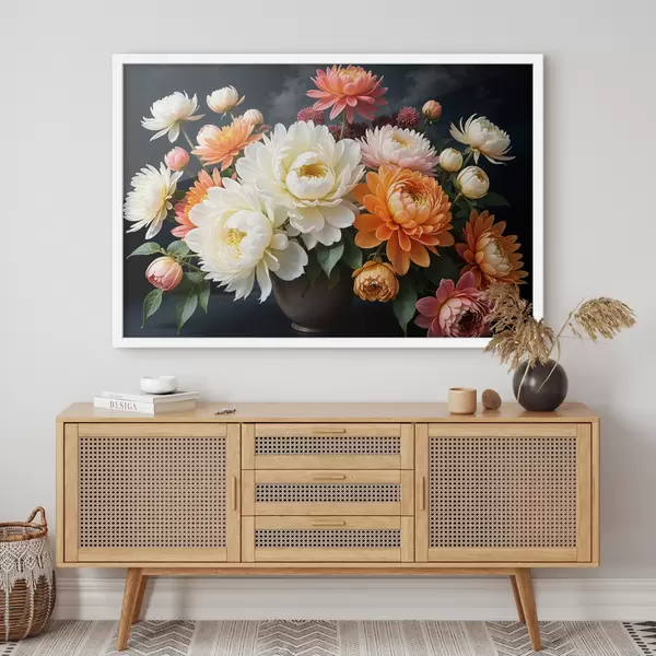Poster Een boeket levendige dahliabloemen in verschillende kleuren tegen een donkere achtergrond Nr f39399