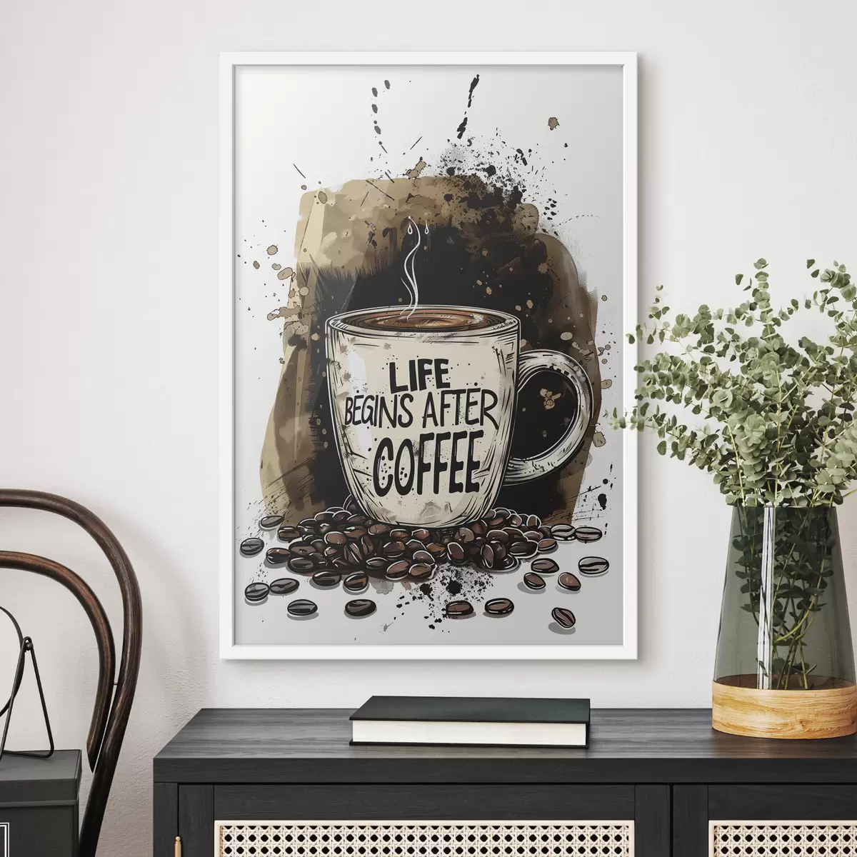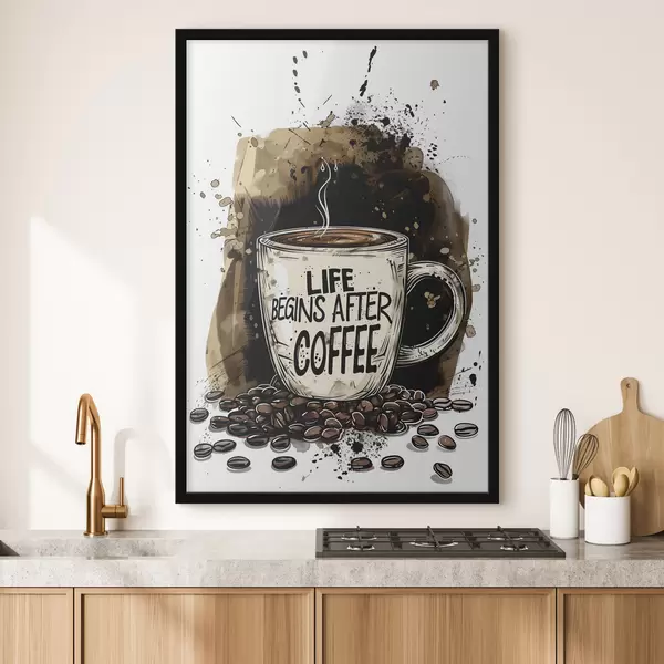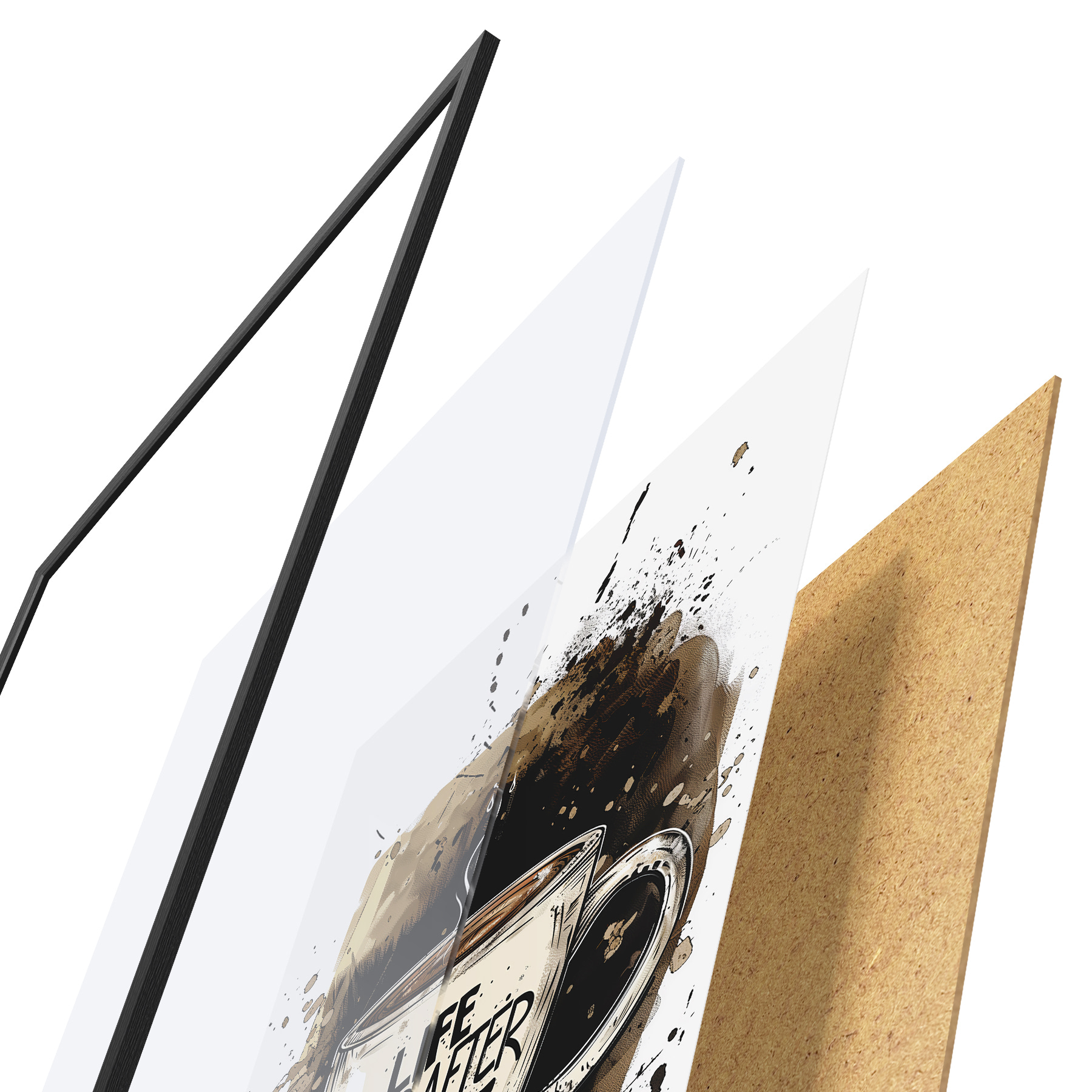De poster bestaat uit een frame, plexiglas, geprinte afbeelding en spaanplaat achterkant. De poster kan meteen aan de muur worden gehangen dankzij de bevestigingen op de achterkant.