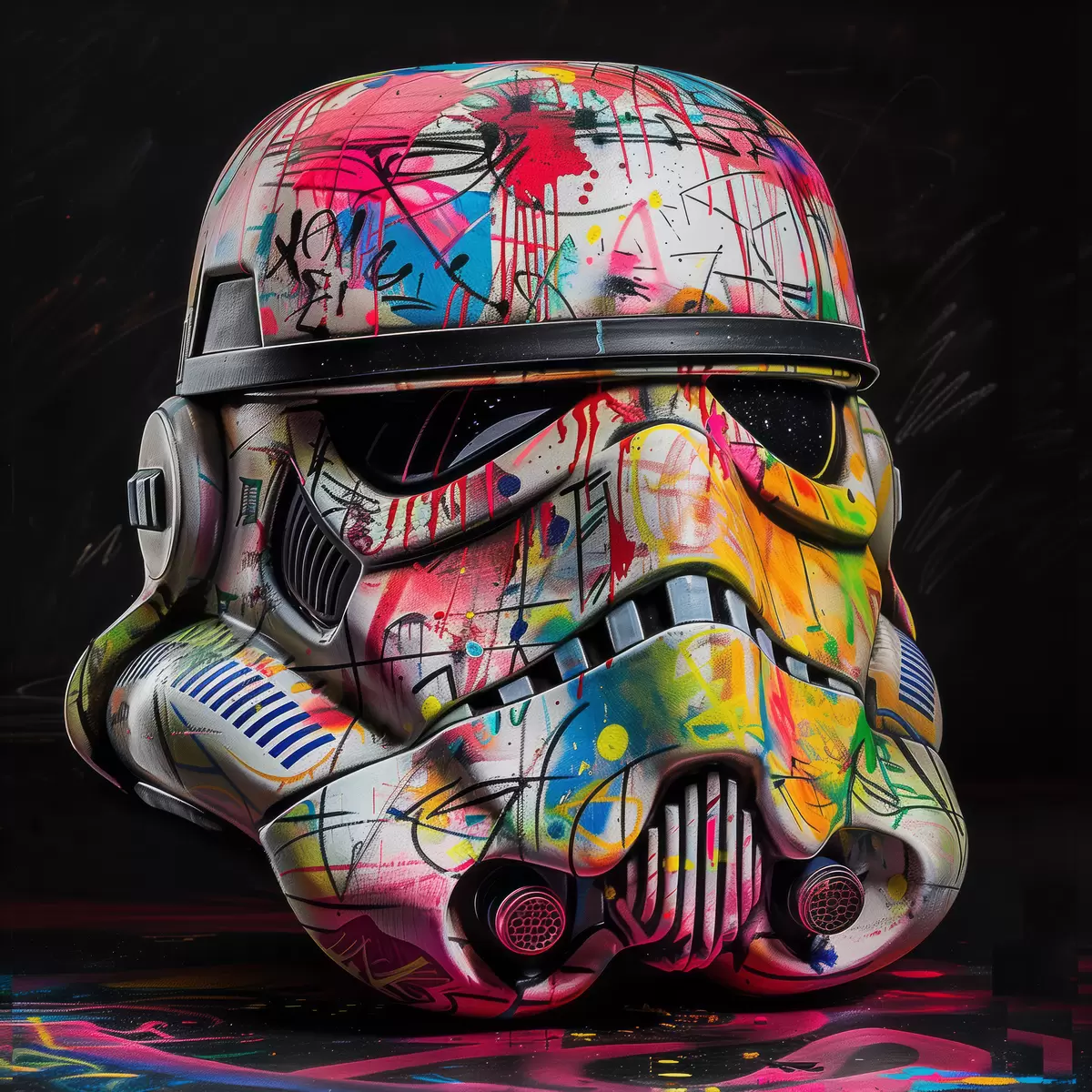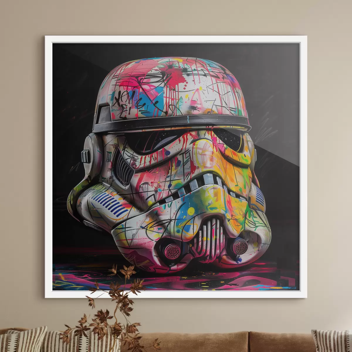 Poster Een Star Wars Stormtrooper-helm bedekt met levendige straatkunst en graffiti Nr f39453