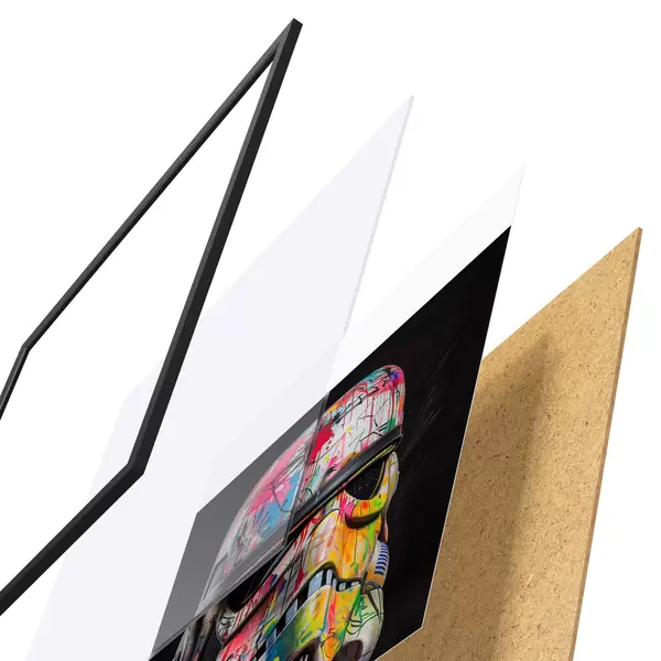 De poster bestaat uit een frame, plexiglas, geprinte afbeelding en spaanplaat achterkant. De poster kan meteen aan de muur worden gehangen dankzij de bevestigingen op de achterkant.