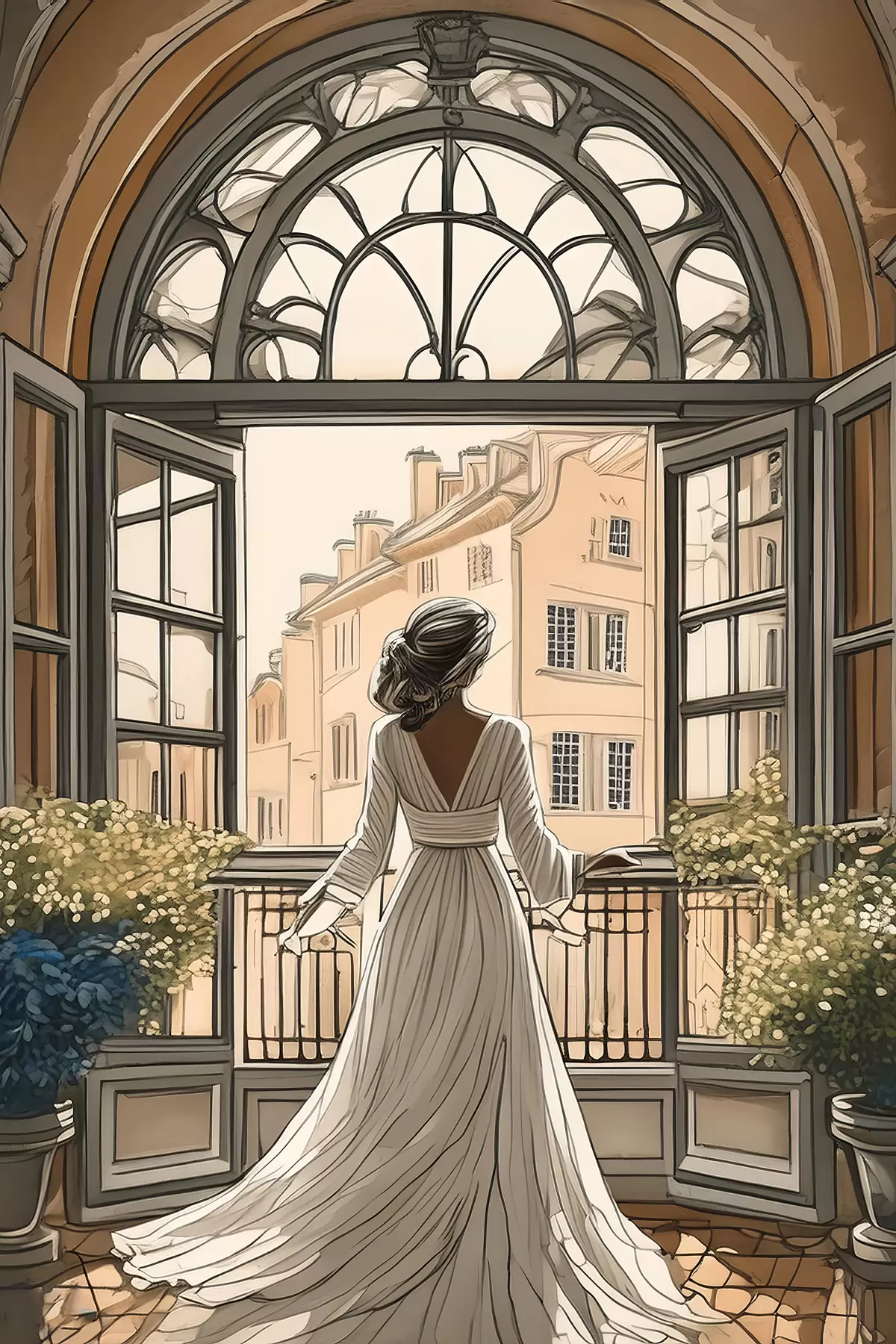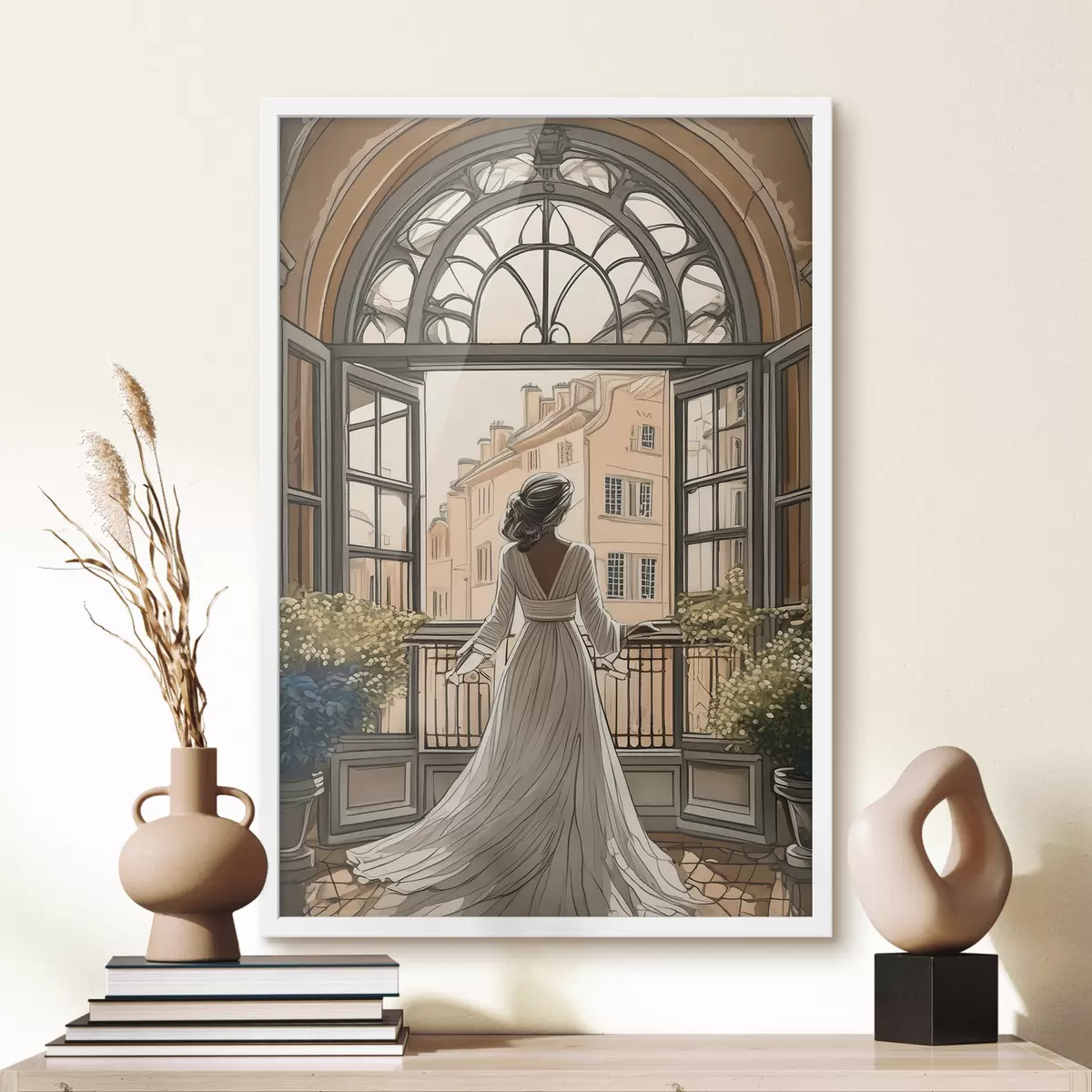 Poster silhouet van een meisje in een witte jurk bij een groot raam Nr f39480
