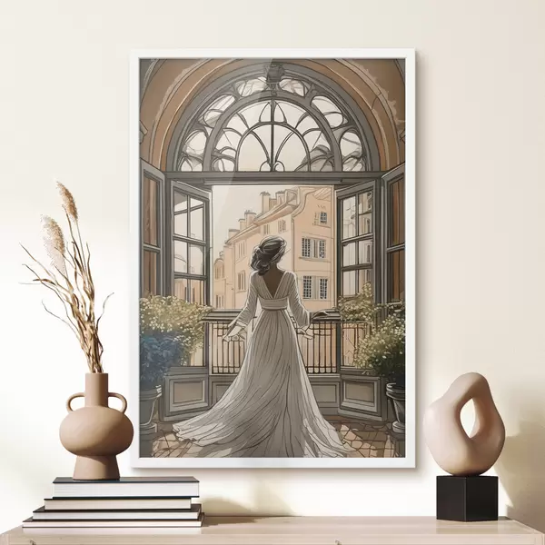Poster silhouet van een meisje in een witte jurk bij een groot raam f39480