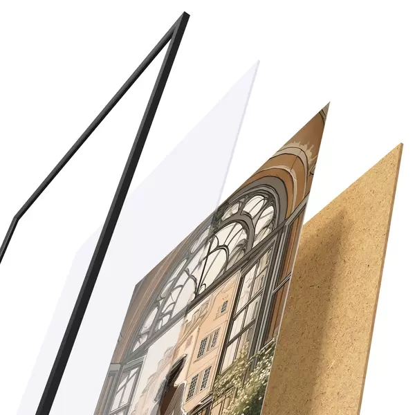 De poster bestaat uit een frame, plexiglas, geprinte afbeelding en spaanplaat achterkant. De poster kan meteen aan de muur worden gehangen dankzij de bevestigingen op de achterkant.