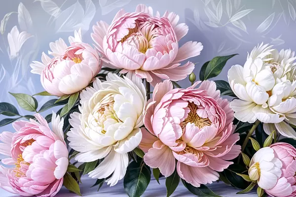 Poster Een boeket van grote, weelderige roze en witte pioenrozen met groene bladeren tegen een zachte, onscherpe achtergrond Nr f39514