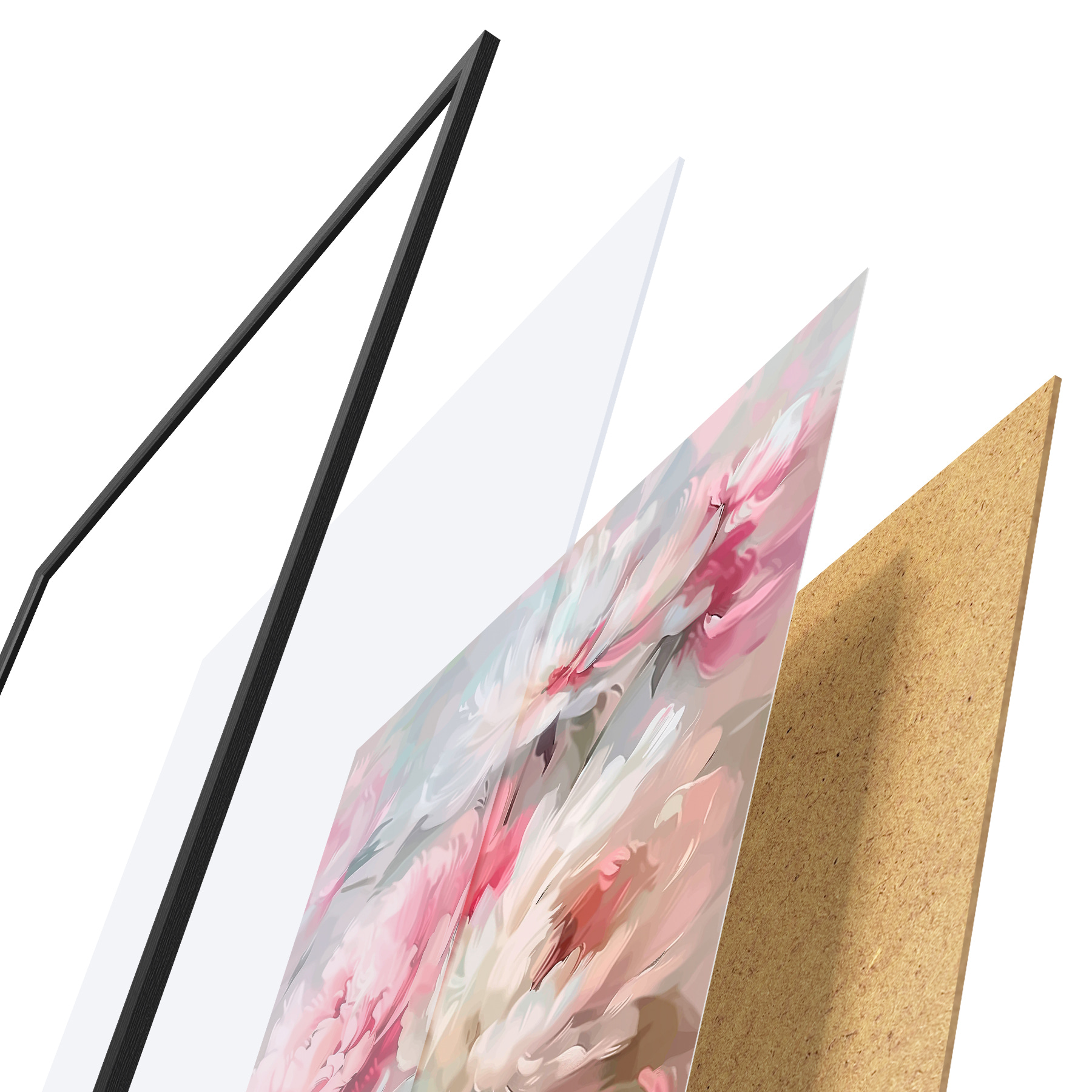 De poster bestaat uit een frame, plexiglas, geprinte afbeelding en spaanplaat achterkant. De poster kan meteen aan de muur worden gehangen dankzij de bevestigingen op de achterkant.