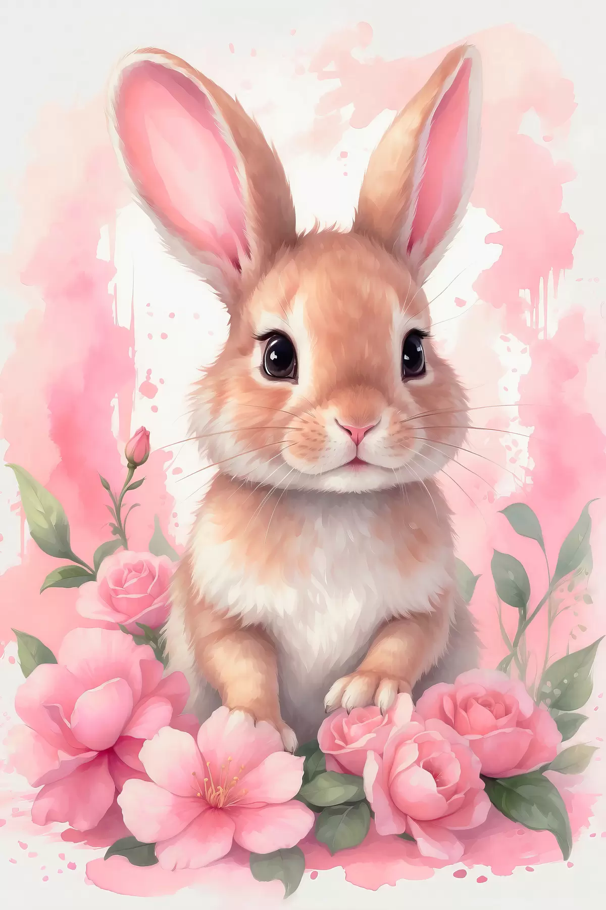 Poster Schattige Haas in roze bloemen f39559
