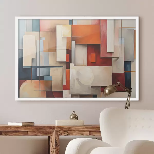 Poster Abstractie in kubismestijl, olieverfschilderij, rode, blauwe, witte kleuren Nr f39571