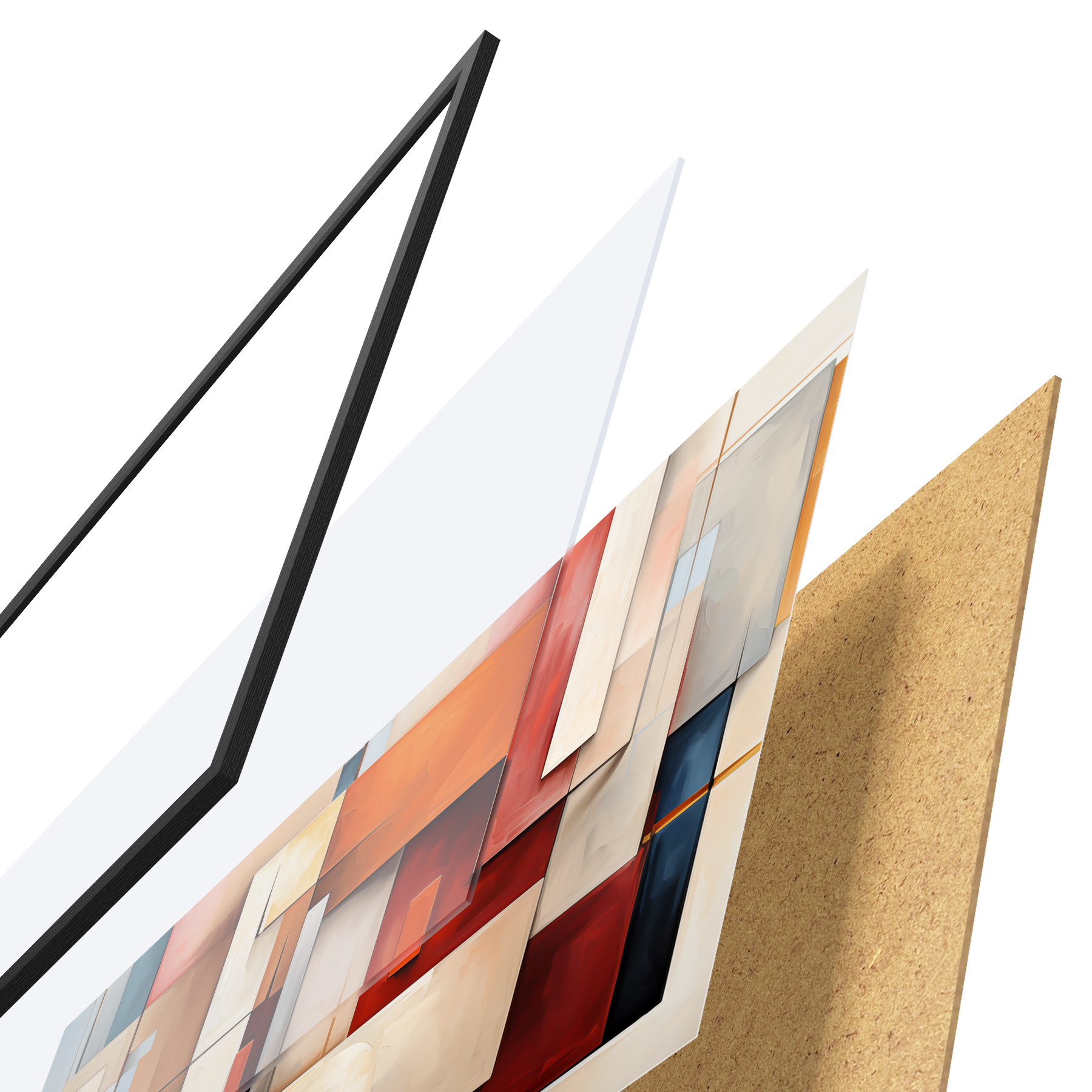 De poster bestaat uit een frame, plexiglas, geprinte afbeelding en spaanplaat achterkant. De poster kan meteen aan de muur worden gehangen dankzij de bevestigingen op de achterkant.