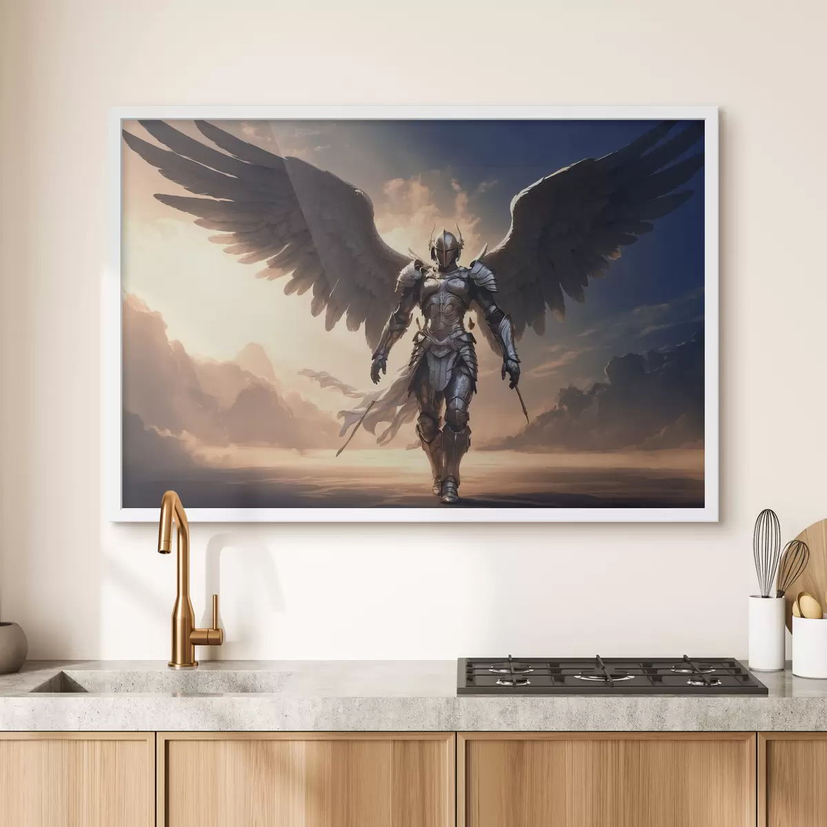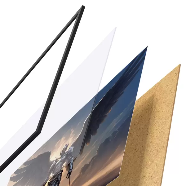 De poster bestaat uit een frame, plexiglas, geprinte afbeelding en spaanplaat achterkant. De poster kan meteen aan de muur worden gehangen dankzij de bevestigingen op de achterkant.