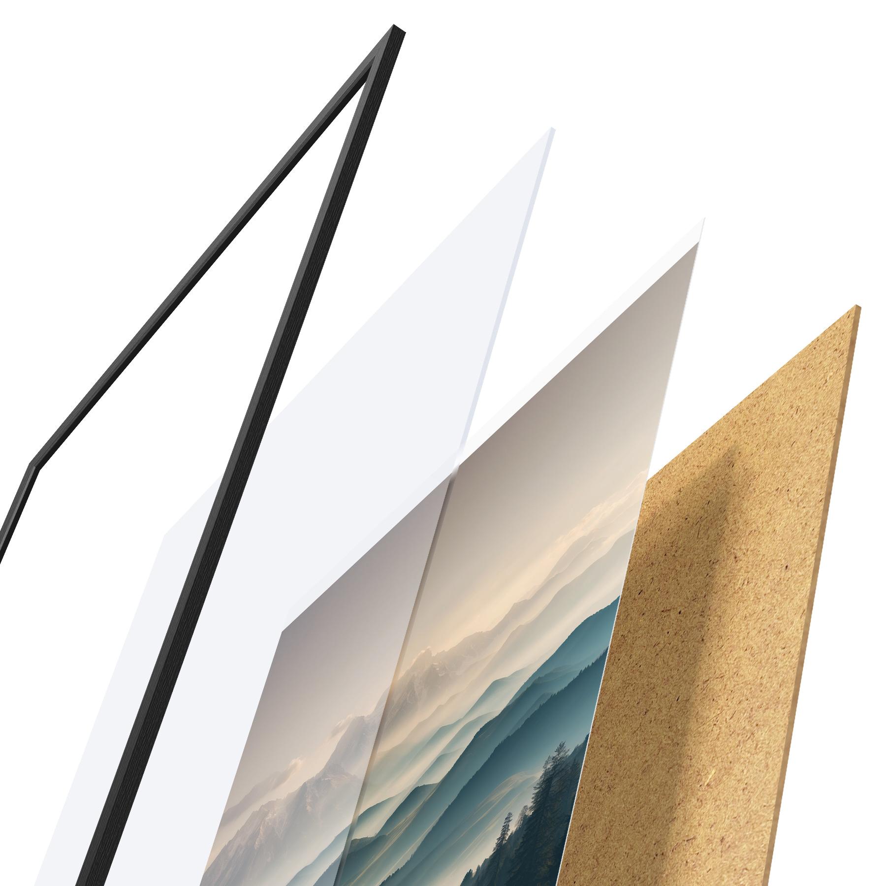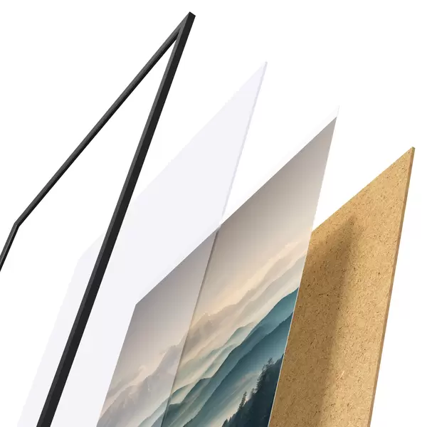De poster bestaat uit een frame, plexiglas, geprinte afbeelding en spaanplaat achterkant. De poster kan meteen aan de muur worden gehangen dankzij de bevestigingen op de achterkant.