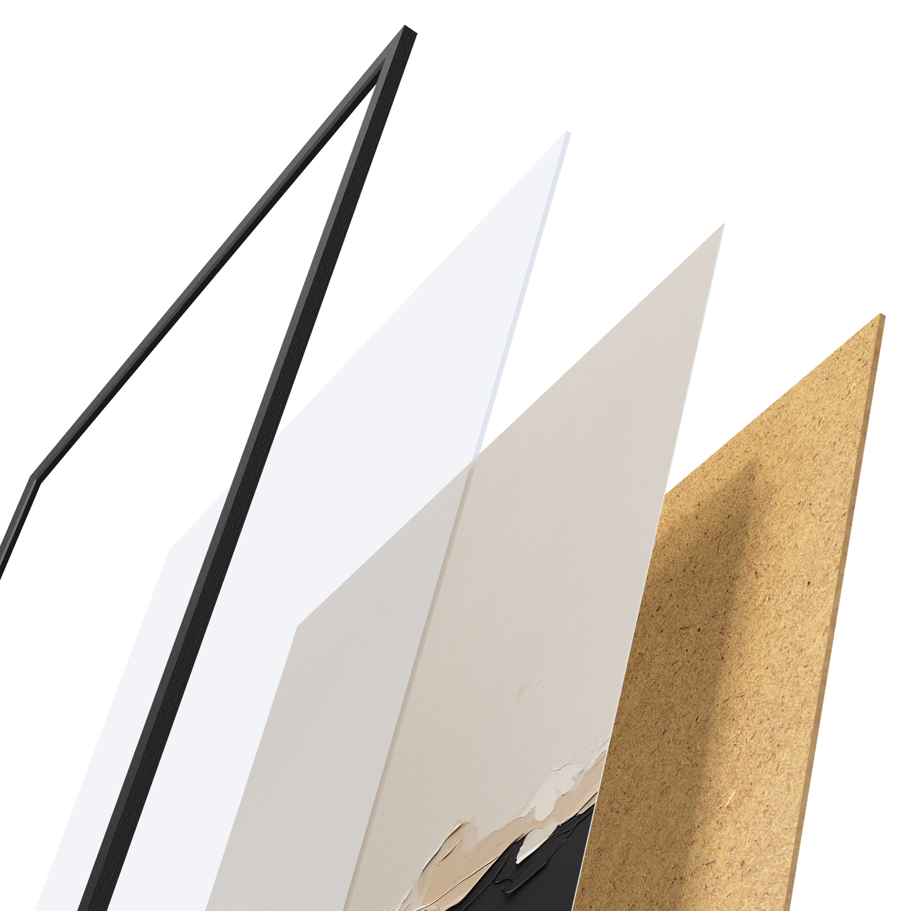 De poster bestaat uit een frame, plexiglas, geprinte afbeelding en spaanplaat achterkant. De poster kan meteen aan de muur worden gehangen dankzij de bevestigingen op de achterkant.