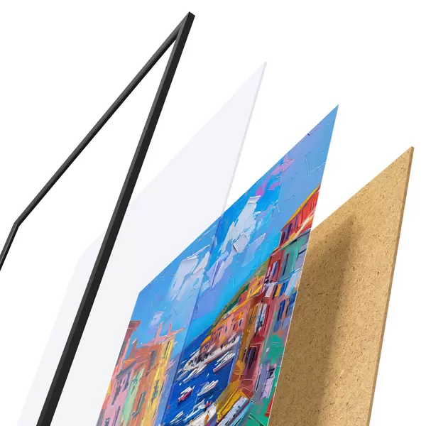 De poster bestaat uit een frame, plexiglas, geprinte afbeelding en spaanplaat achterkant. De poster kan meteen aan de muur worden gehangen dankzij de bevestigingen op de achterkant.