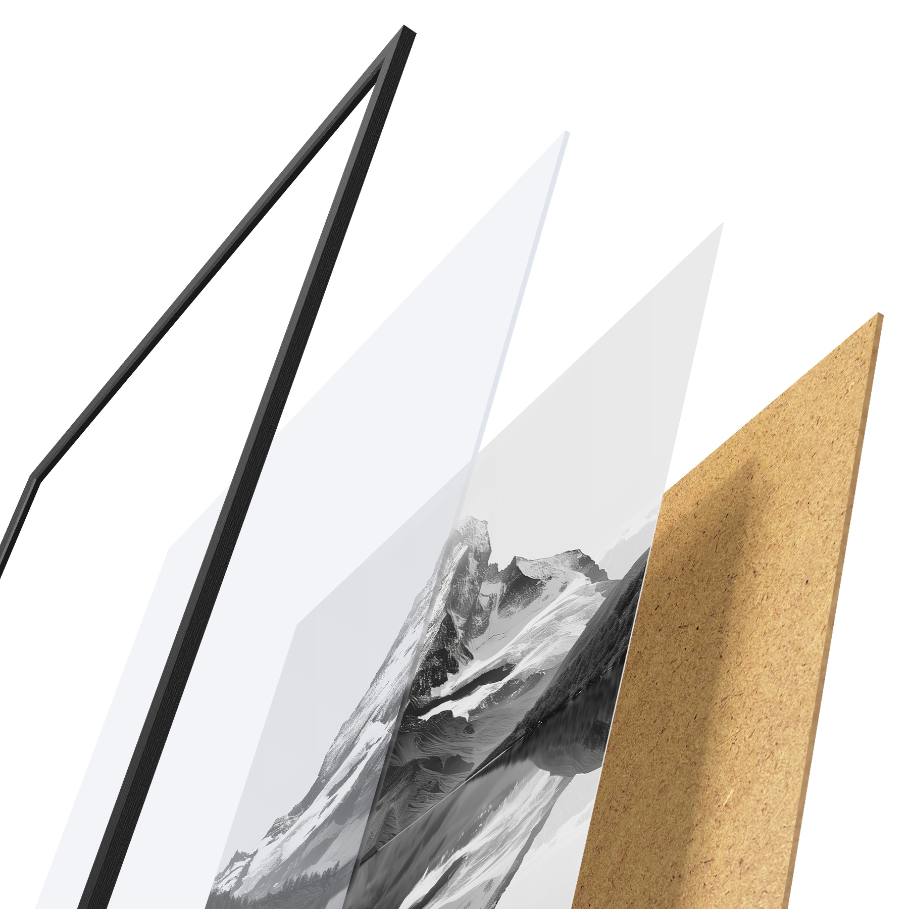 De poster bestaat uit een frame, plexiglas, geprinte afbeelding en spaanplaat achterkant. De poster kan meteen aan de muur worden gehangen dankzij de bevestigingen op de achterkant.