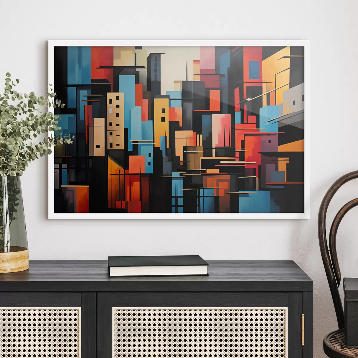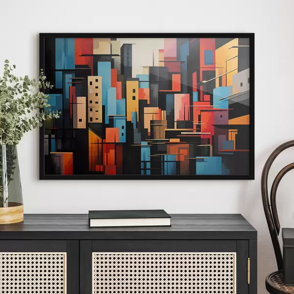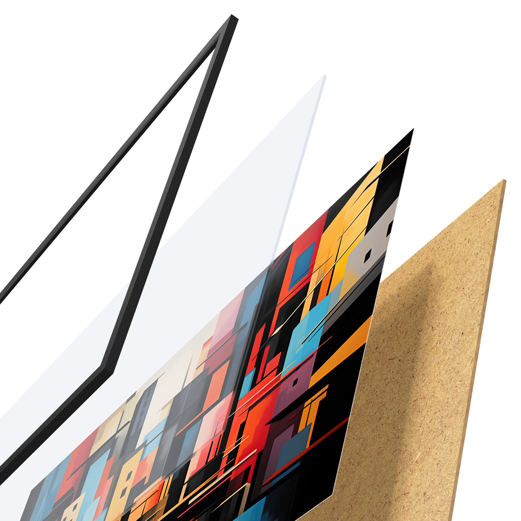De poster bestaat uit een frame, plexiglas, geprinte afbeelding en spaanplaat achterkant. De poster kan meteen aan de muur worden gehangen dankzij de bevestigingen op de achterkant.