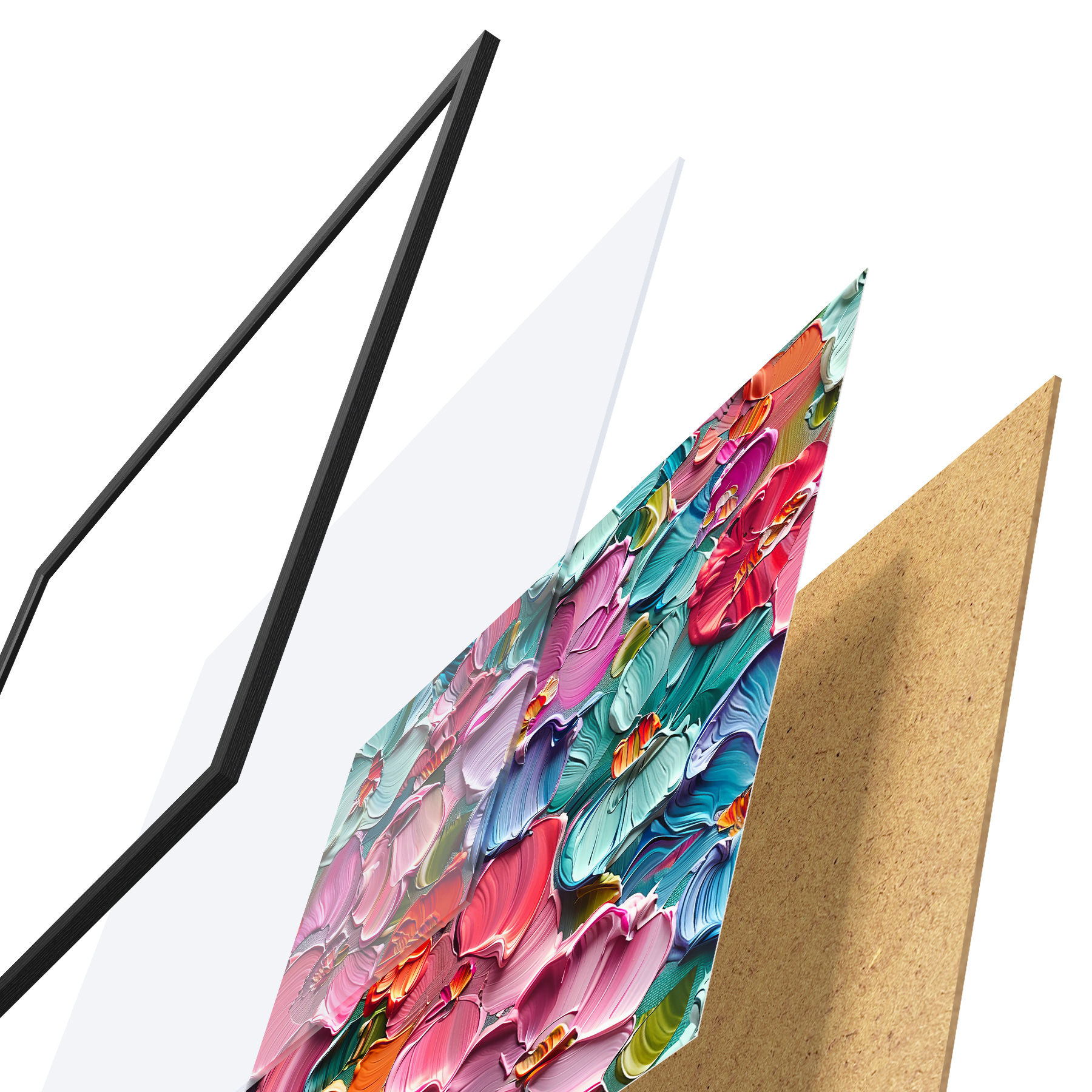De poster bestaat uit een frame, plexiglas, geprinte afbeelding en spaanplaat achterkant. De poster kan meteen aan de muur worden gehangen dankzij de bevestigingen op de achterkant.
