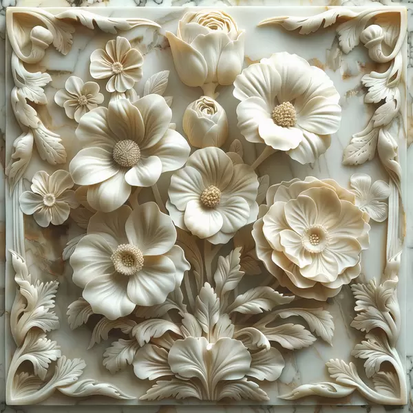 Poster 3D witte bas-reliëf bloemen op een marmeren achtergrond met een frame Nr f39739