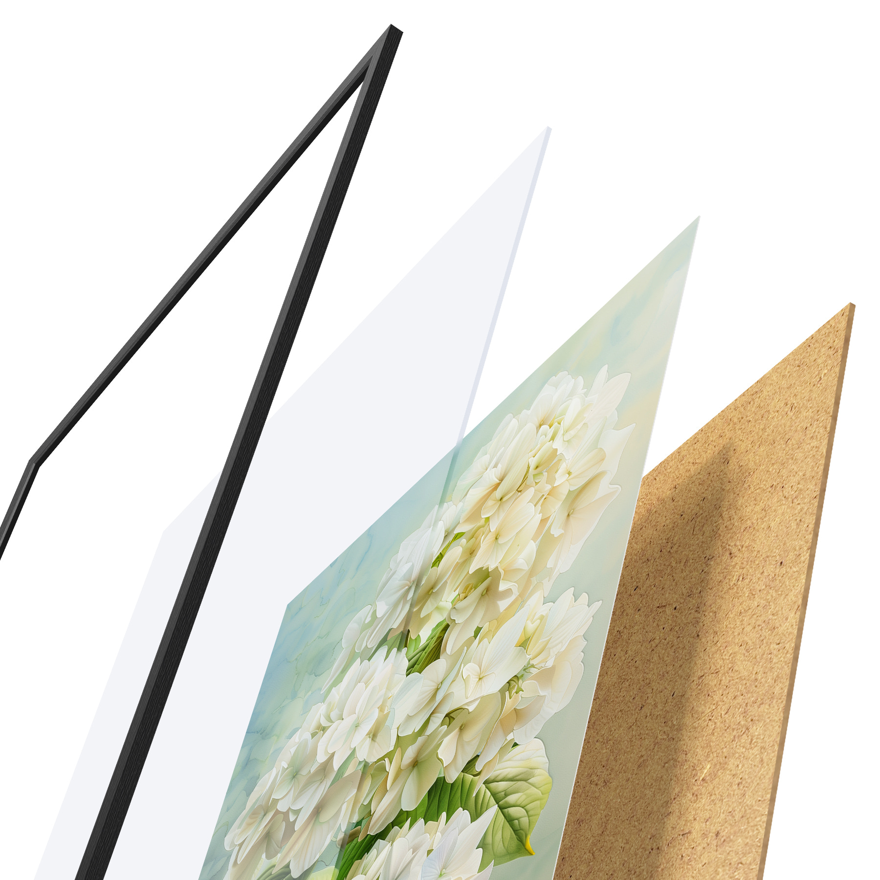 De poster bestaat uit een frame, plexiglas, geprinte afbeelding en spaanplaat achterkant. De poster kan meteen aan de muur worden gehangen dankzij de bevestigingen op de achterkant.