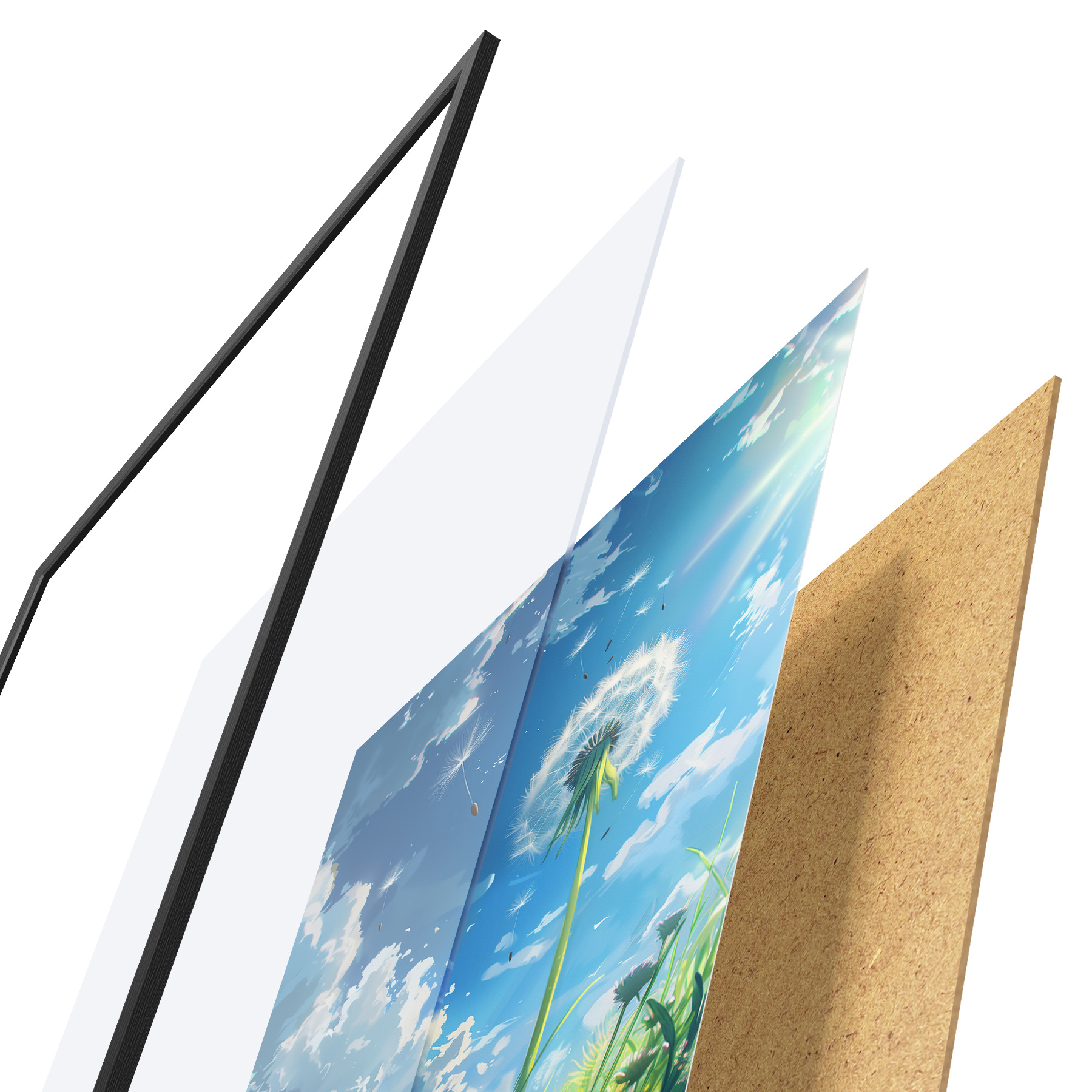 De poster bestaat uit een frame, plexiglas, geprinte afbeelding en spaanplaat achterkant. De poster kan meteen aan de muur worden gehangen dankzij de bevestigingen op de achterkant.