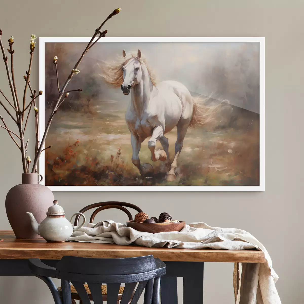 Poster Wit paard dat over het olieverfschilderij van de weide galoppeert Nr f39818