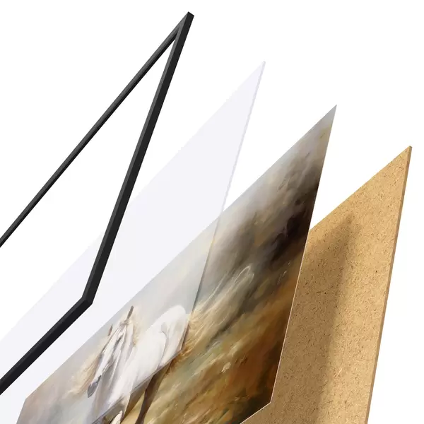 De poster bestaat uit een frame, plexiglas, geprinte afbeelding en spaanplaat achterkant. De poster kan meteen aan de muur worden gehangen dankzij de bevestigingen op de achterkant.